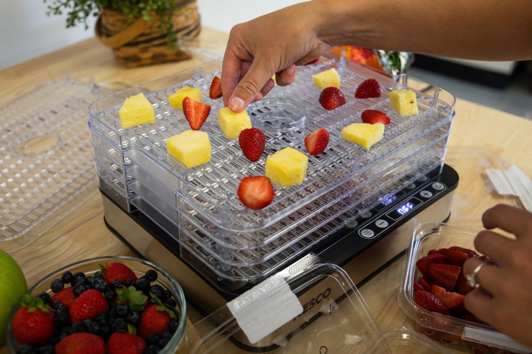 5 BPA-Free Trays – Includes five plastic drying trays (12" x 9.5") for small to medium batches of jerky, dried fruit, herbs, and more. Adjustable Temp & Timer – Customize drying with a digital timer (1–24 hours) and adjustable temperature range from 95°F to 160°F (35°C–70°C). 500 Watts of Power – Provides quiet and consistent heat distribution for evenly dried snacks—no need to rotate trays. Durable Plastic Housing – Lightweight yet sturdy construction designed for everyday kitchen use and easy cleanup. Built-In Cord Storage – Convenient bottom compartment keeps the power cord neatly stored when not in use. Ideal for Homemade Snacks – Great for creating preservative-free jerky, fruit leather, veggie chips, herbs, or dog treats right at home.