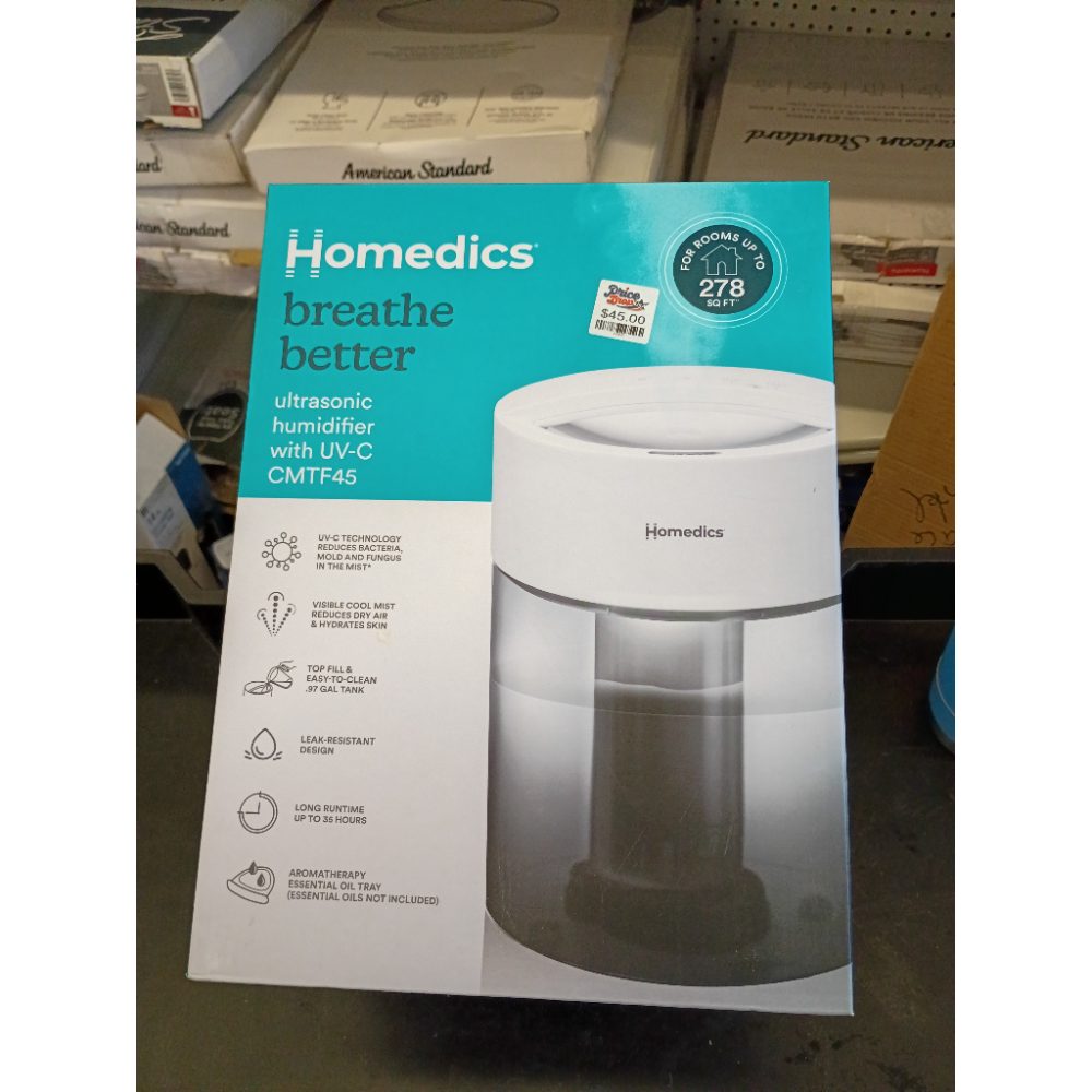 Visible Cool Mist: Ultrasonic membrane converts water into a fine mist that is dispersed evenly into the air; Clean reminder lets you know when to clean the ultrasonic membrane so your humidifier works like new UV-C Technology: This leak resistant humidifier uses a UV-C LED to reduce bacteria, mold, and fungus that may be in the humidifier's mist; use in spaces up to 278 sq. ft. . Reduces E. coli bacteria, A. niger mold, and P. citrinum fungus in the mist with UV-C on. Shown by independent third-party testing. Based on AHAM HU-1-2016 measurement as shown by independent third-party testing. Top-Fill Tank: 0.97-gallon water tank with carry handle provides up to 35 hours of runtime per fill; Clean Tank Technology helps protect the tank from mold and mildew; tank with large opening for easy cleaning Adjustable Settings: Choose from 3 mist settings to best fit your space; enjoy the benefits of aromatherapy with 3 included essential oil pads; built-in night-light and auto shutoff for nighttime use What’s in the Box: (1) HoMedics TotalComfort UV-C Ultrasonic Humidifier; (1) Instruction Book, (3) Essential Oil Pads, (1) Demineralization Cartridge, (1) 2-Year Limited Warranty