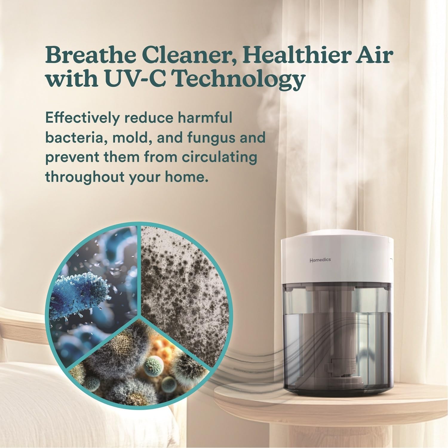HoMedics Humidifiers for Bedroom, Home, Nursery, Office and Plants. Total Comfort UV-C Ultrasonic Humidifier, Leak Resistant Design, 0.97 Gallon Tank, 35 Hour Run Time, Quiet, Cool Mist, Night Light