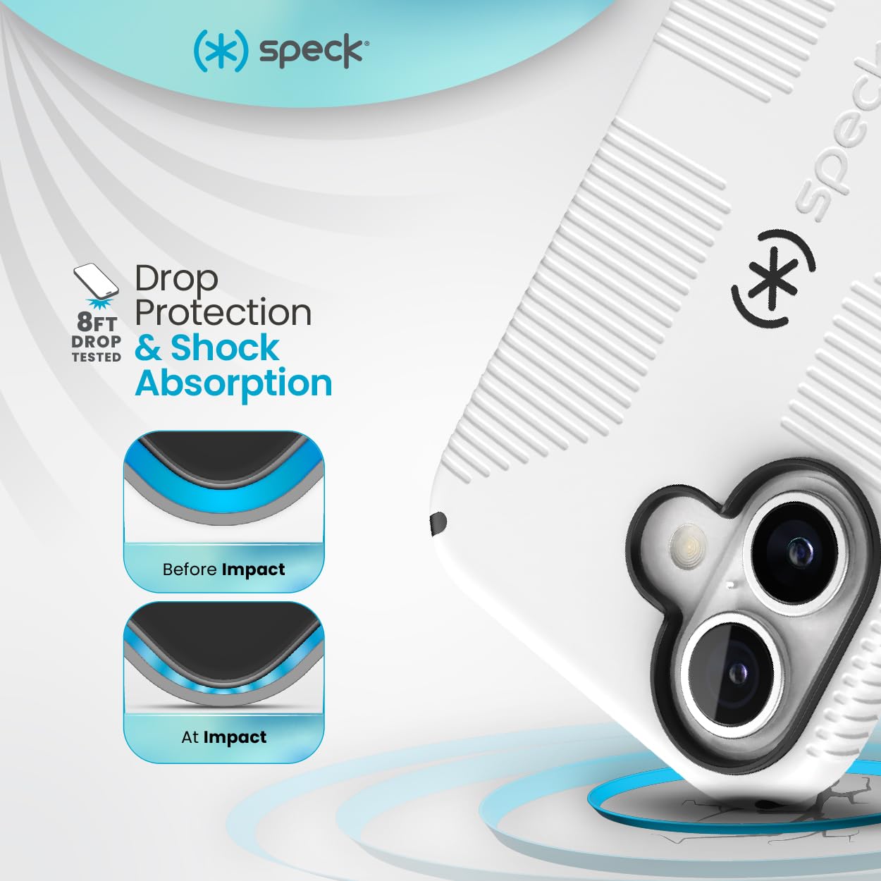 • NO-SLIP GRIP - Speck's iPhone16 Plus case provides a precise fit with no-slip, raised rubber grips. Its slim design ensures full access to all ports and buttons while offering exceptional drop protection to keep your phone pristine. Dual-Layered Construction.