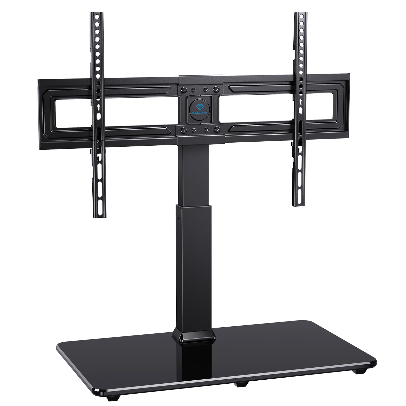 ?Universal Design?Universal TV stand fits most 37"-75" TVs(including 37'' 39'' 40'' 42'' 43'' 49'' 50'' 55'' 60'' 65'' 70'' 75"), VESA(mounting holes pattern): 200X100-600X400mm(8"x4"-24"x16"). Our table top TV stand is compatible with Sony/Samsung/Vizio/Insignia/TCL/LG TVs in bedroom,school,office and so on. Solid steel pillar provides stable support for your TV, well made and good looking. ?Larger Glass Base? The black tempered glass gives an added touch to your home theater system and balance TV’s weight and keep the whole unit steady. High quality steel construction ensures safety, protecting the television from your kids/pets so it would not knock them over. ?Adjustable Height?The TV mount stand with totally 9 combined height choices will grant you more freedom than any other counterpart on the market. The TV plate has 3 height settings and TV brackets as well have three height choice, which would heighten your plenty of space to place sound bar or place your TV at the lower level to keep it from tipping. ?Problem Solver? The distance between the legs of two-legged TV stands is too large, which requires a longer entertainment center. Center TV stand-Your NO.1 Mounting Solution Provider! Allows you to purchase a narrow TV cabinet and save space. Besides, we have the most considerate after-sale service which will help you dealing with any problem, one call is all it takes. ?Swivels 70°To Glare Eliminating?This swivel TV stand is capable of +/-35° swivel from side to side, and being able to watch TV from different seating locations has been better than simply shifting TV with a fixed stand! In addition, unnecessary to drill holes in the wall to mount and conveniently move to fit where it needed to go! ?PURCHASE WITH CONFIDENCE?High-quality steel structure ensures safety and stability. PERLESMITH guarantees this product to be free from defects in materials and workmanship during the 5-year limited warranty period.
