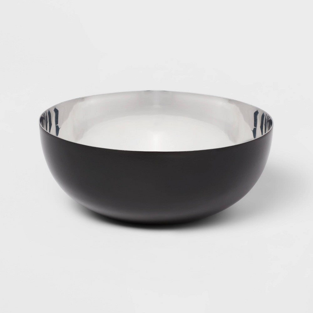 Bring style to your dinnerware with this Metal Serving Bowl from Threshold™. Designed in a classic round silhouette, this metal serving bowl is great for serving a variety of salads, cut fruits, snacks and more. Showcasing a glazed black outer with a metallic interior, it adds striking appeal to your tableware. Coordinate with similar serveware to bring a cohesive touch to your table setting. Threshold™: Quality & Design / Casual classics for house and home.