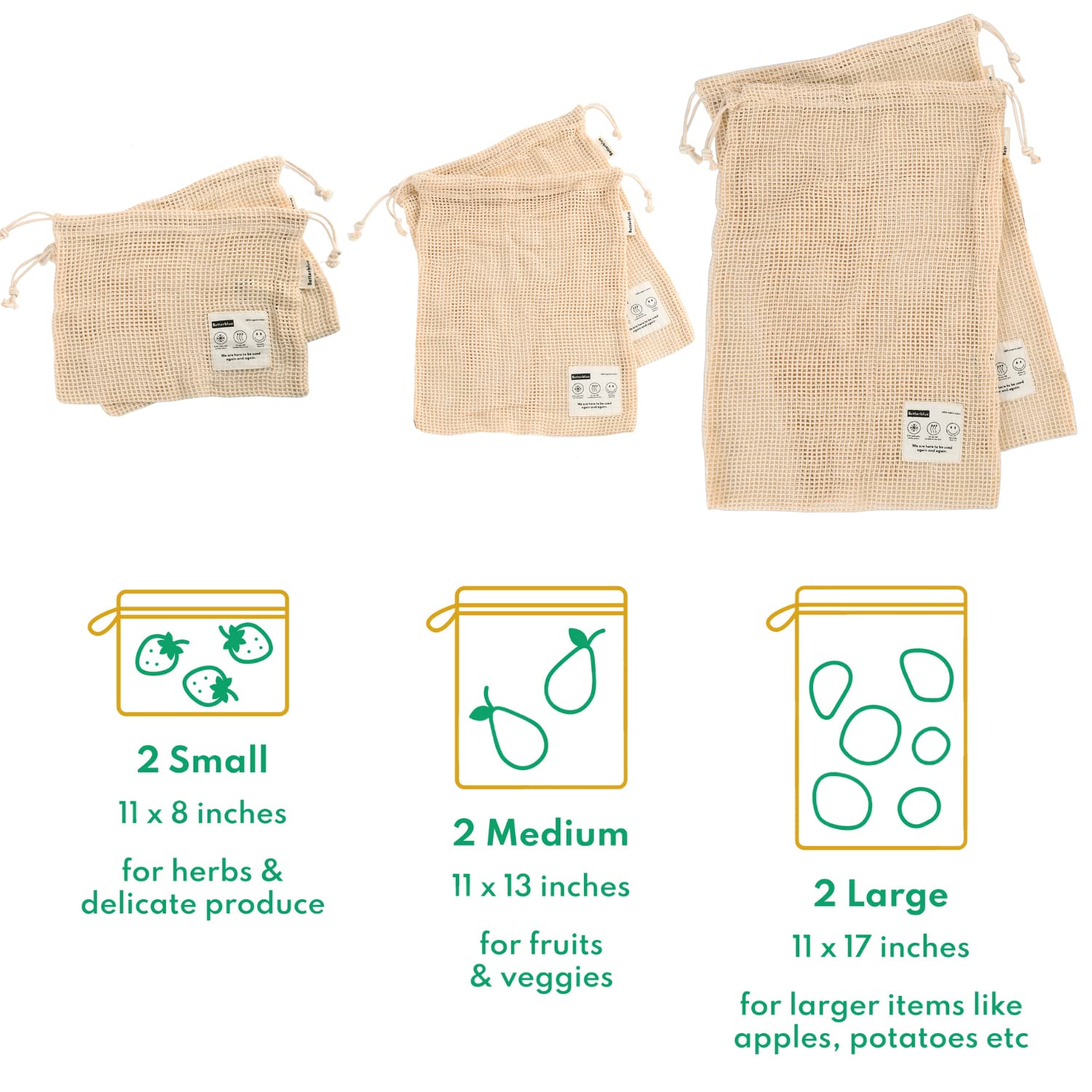 ?? We keep it 100 - bags are made of 100% organic cotton & packaged with 100% recycled material ?? They're handy - breathable mesh and easy-pull drawstrings keep herbs fresh and vegetables secure ?? They’re tough - tightly woven mesh is durable, machine washable, and biodegradable 6?? They’re versatile - every set comes with 6 total bags, 2 each of 3 sizes: 11x8, 11x13, and 11x17 ?? They're easy - cold wash with similar colors, air dry or tumble-dry on low. Honestly, that’s it! ?? Betterblue - We’re on a mission to help save the #1 planet in the universe by keeping our ocean blue & free of plastic.