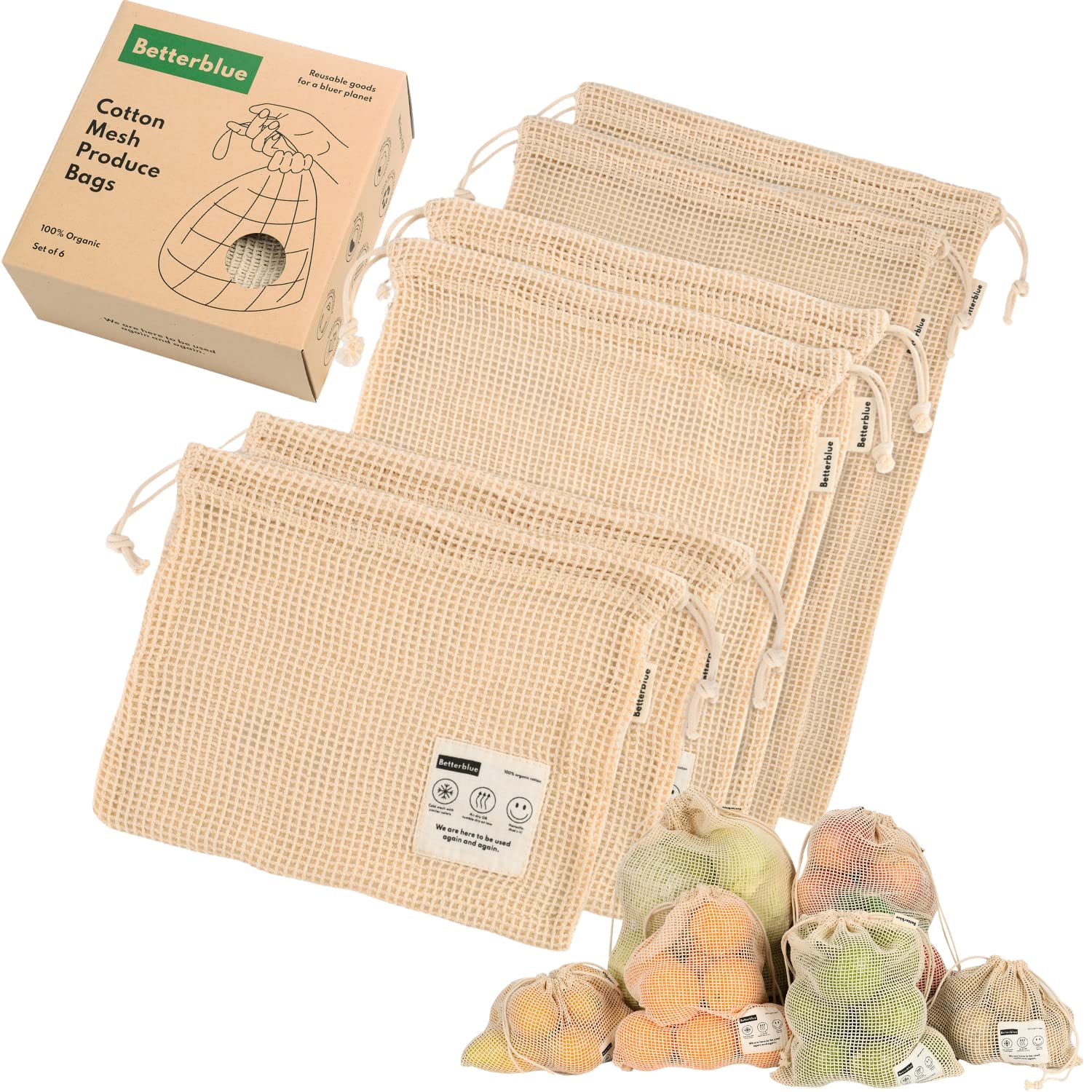 Betterblue 100% Organic Cotton Produce Bags, Reusable & Eco Friendly, Set of 6