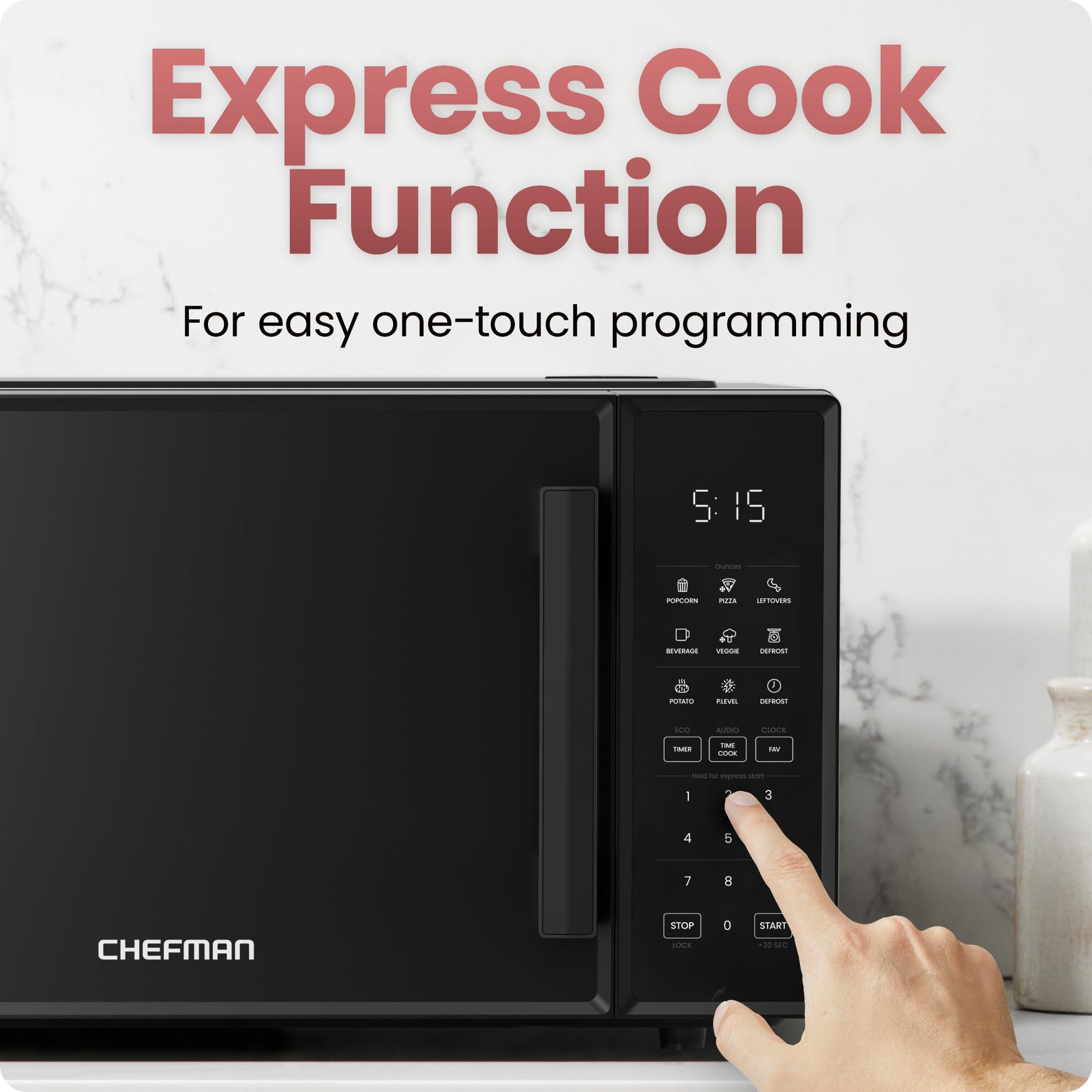 Chefman Countertop Microwave Oven 0.9 Cu. Ft., 900 Watts with 10 Power Levels, 6 Cooking Presets with One-Touch Express Cook, Eco Mode, Child Safety Lock, & Mute Button - Black