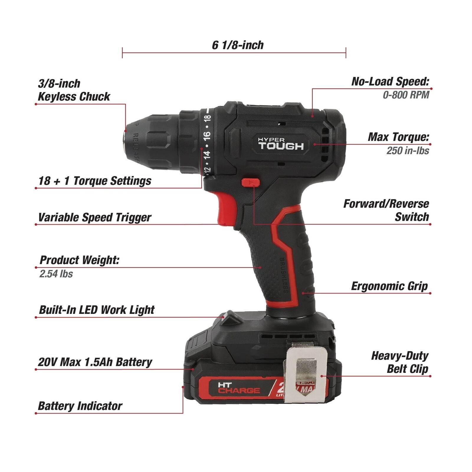 The Hyper Tough 20V Max 1.5AH Cordless Drill is your go-to tool for tackling a variety of tasks around the house or on the job site. Designed with a 3/8-inch keyless chuck this drill allows for quick and easy bit changes saving you time on your projects. The built-in LED work light provides excellent visibility in low-light areas while the belt clip adds convenience by keeping the tool within easy reach. With 18+1 torque settings and a no-load speed of up to 800 RPM this drill offers the versatility and power you need for both delicate and heavy-duty tasks. Delivering a maximum torque of 250 in-lbs and weighing only 2.54 lbs it s the perfect lightweight tool for any DIYer or professional.