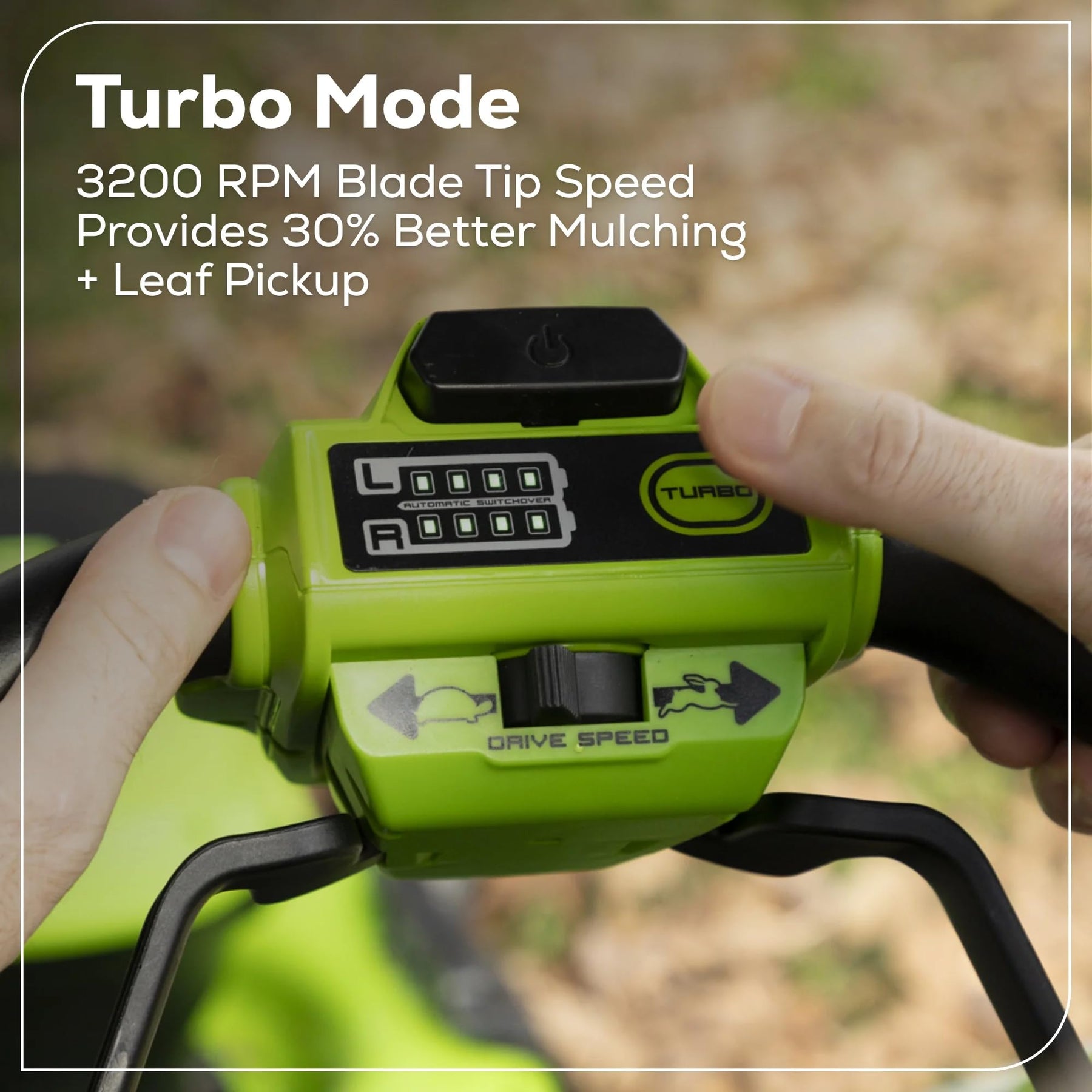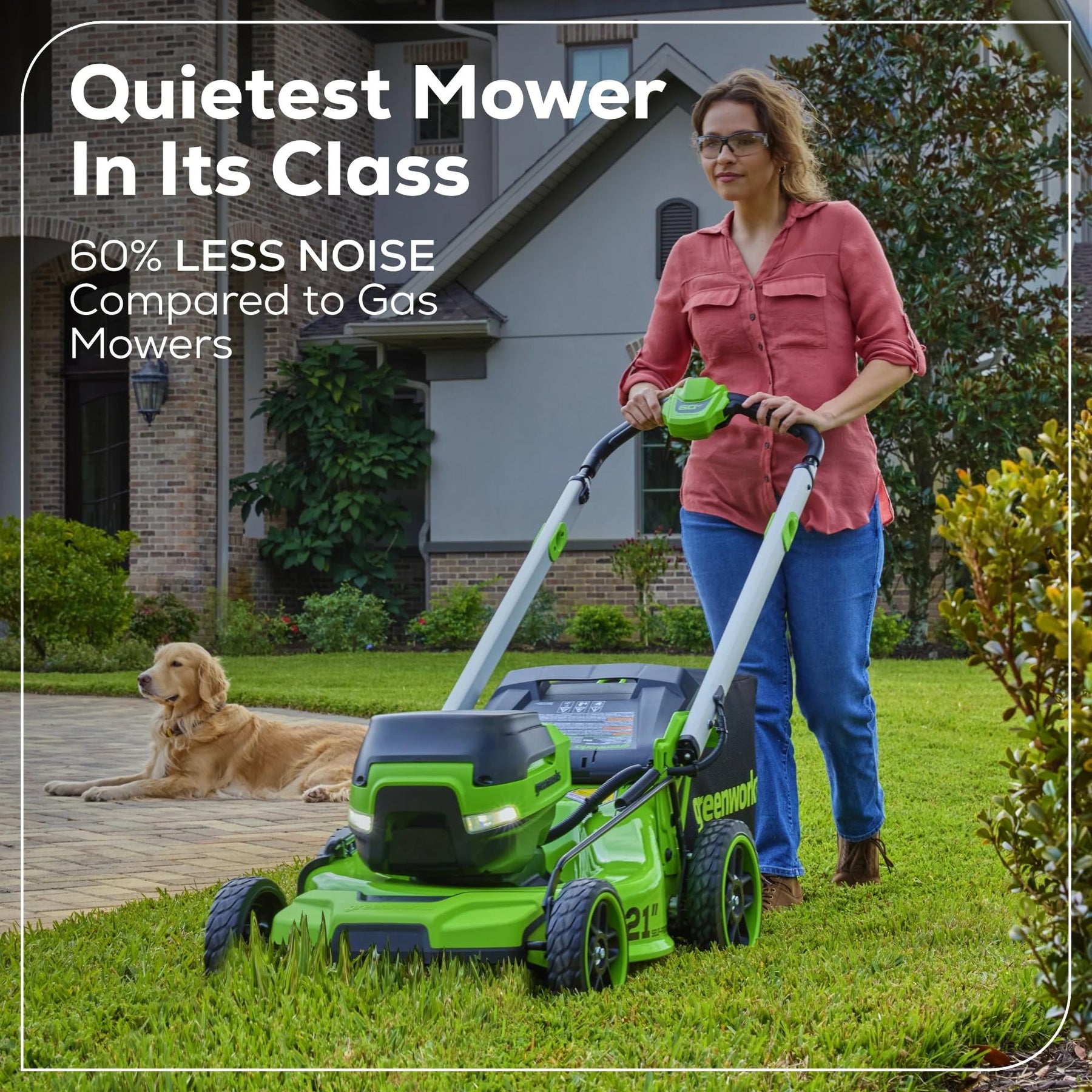 Powerful & Efficient Performance - Covers up to 1 acre on a single charge with a 100-minute runtime for both batteries to be fully charged. Quick 80-minute recharge time with the included charger—less downtime, more mowing. Enhanced Visibility & Convenience - Bright LED headlights provide optimal visibility for early morning or evening mowing sessions. Vertical storage, reducing storage space by up to 70% for compact garage or shed storage. Versatile 4-in-1 Lawn Care System - Choose your preferred cutting style: mulch, bag, side discharge, or turbo leaf pickup for a pristine lawn. Advanced Brushless Motor - The high-efficiency brushless motor provides superior power and extends the mower’s longevity. It ensures consistent performance, allowing you to tackle even the toughest mowing tasks with ease and reliability. Complete Ecosystem Value- Battery-powered lawn mower includes battery, fast charger, grass bag & 4 year tool + 4 year battery warranty Works with 75+ Greenworks 60V tools(trimmers, blowers, chainsaws...)—expand your cordless toolkit.