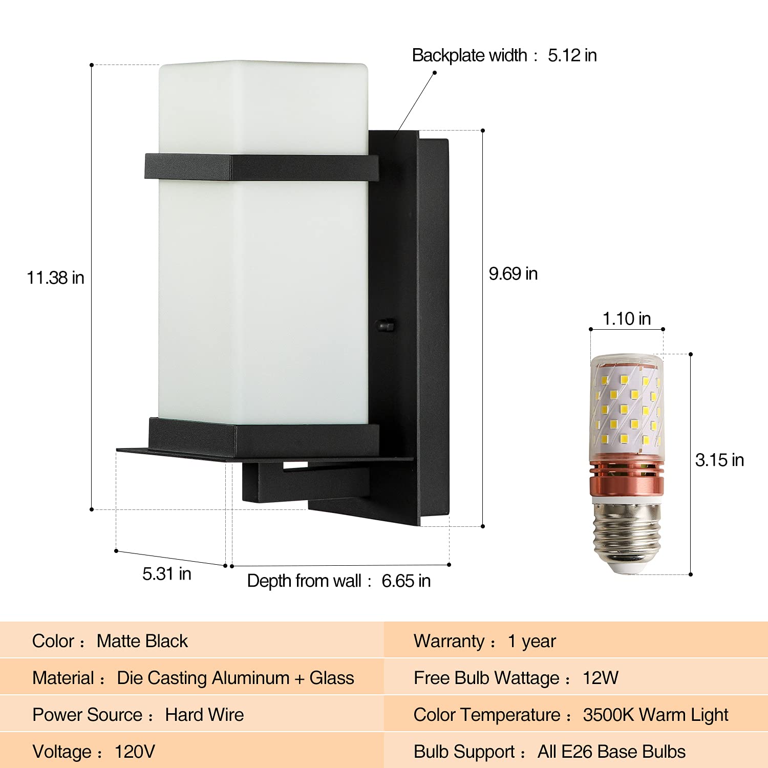 ?Widely Use?: Our outdoor wall light fixtures with frosted glass shade, can add more elegant and modern elements to your home decor, also can provide sufficient but not dazzling light in the garage, deck, porch, doorway, garden, courtyard, hallway, patio, entryway ,adding a warm atmosphere for your home. ?Premium Quality?: Our outdoor wall scone is made of die-casting aluminum, resulting in anti-corrosion, anti-rust and anti-faded. Waterproof design allows it to be used outdoors for many years without corrosion. ?Easy to Install?: All installation accessories and instructions are included in the package, you just need to install the lights in few simple steps-1.Attach the cross bar to junction box 2. Make wire connection 3. Fasten this wall sconce to the cross bar 4. Install the bulb and lampshade. ?Product Dimension?:Width:5.31",Height:11.38",Extends 6.65" from the wall. Back plate is 9.69â€high x 5.12â€wide. This exterior light is fully compatible with incandescent, LED, CFL, halogen bulbs, dimmable bulb, smart sensor bulb(dusk to dawn) (Max.100W). The provided free bulb(12W,3500K) will not covered by warranty or after-sales. ?No Risk Purchase?- We promise you - Quality First, Service Utmost. If there is any problems with our outdoor porch light, please feel free to contact us through Amazon. we’ll supply 24-hour service online.