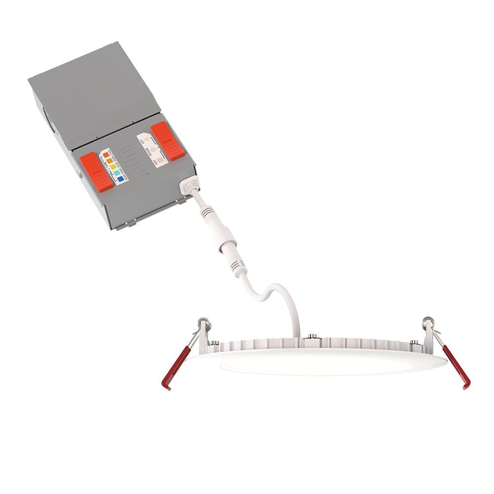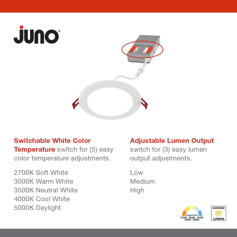 INNOVATIVE LED CEILING LIGHT: Juno Wafer LED Downlights feature a switch for easy color temperature adjustment and eliminate the need for recessed housings; An innovative slim design allows for easy remodel or new construction installation from below 15-IN-1 LED LIGHTS: Integrated switch allows for color temperature adjustments - choose 2700K Soft, 3000K Warm, 3500K Neutral, 4000K Cool, or 5000K Daylight white light; Low, Medium, High lumen options support install at different ceiling heights EASY-TO-INSTALL RECESSED LIGHTING: Ultra-Thin design with remote driver box fits confined spaces; Ideal for kitchen ceiling light, bathroom ceiling light, soffits, and shallow plenum areas; No housing required eases setup and reduces installation time SMOOTH TRIM DESIGN: Matte white finish delivers modern appeal for ceiling lighting in living rooms, basements, hallways; Wet location listed for use as shower light or outdoor ceiling light; Polycarbonate lens ensures consistent, even illumination SPECIFICATIONS: Dimensions - 6.69" Diameter x 1.25" H; 50,000-hour rated life; Dimmable down to 10% with standard dimmers; Lumen options - 800/1050/1300; Replaces 75W incandescent; ENERGY STAR certified; CSA listed; IC rated 5-year warranty