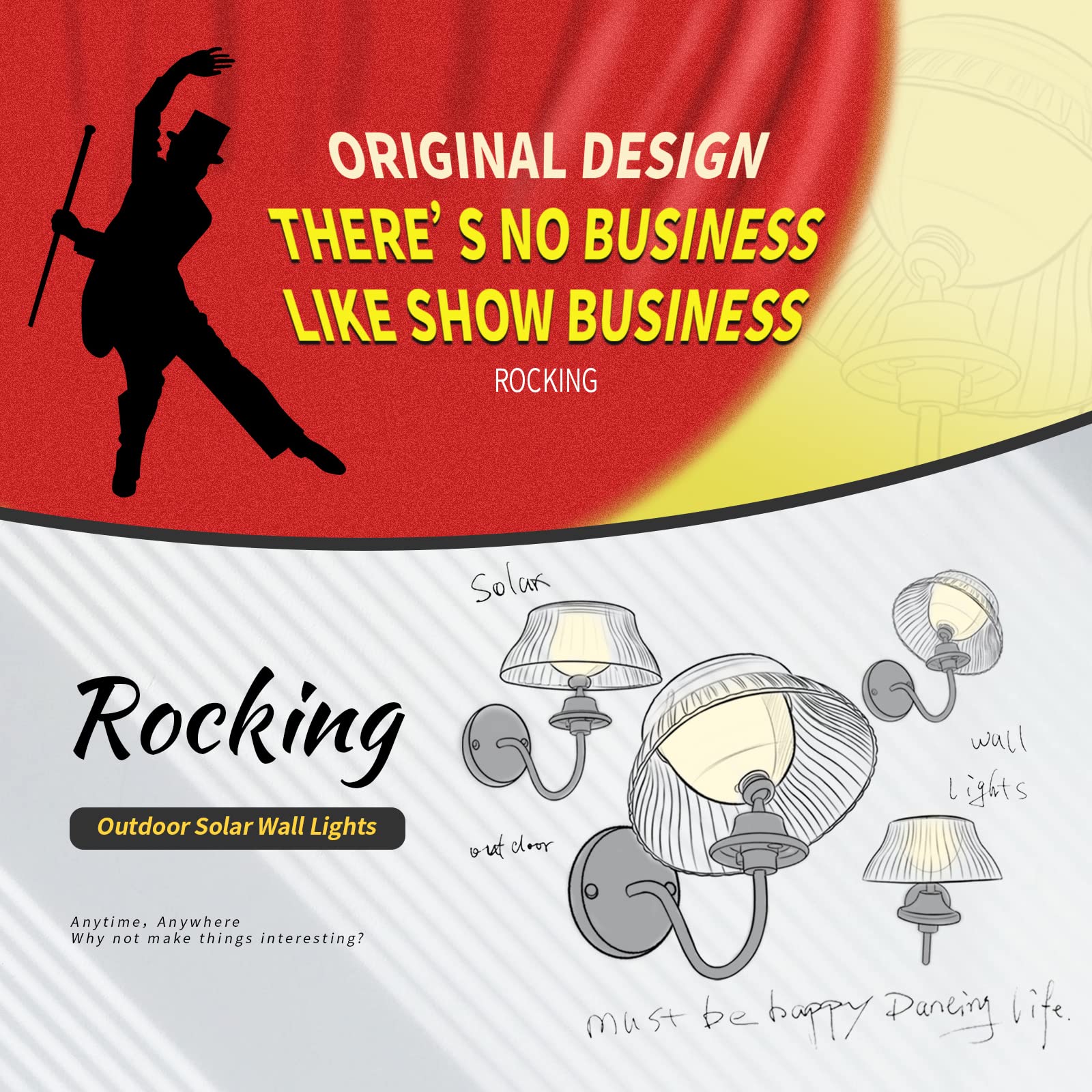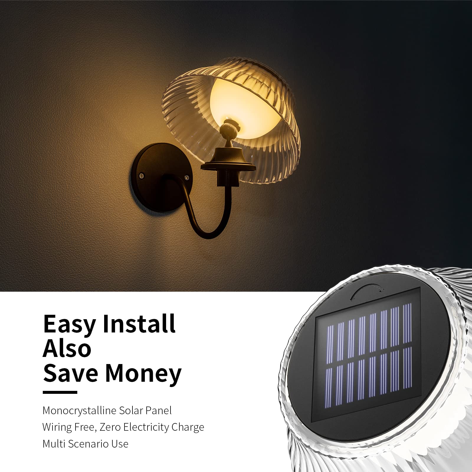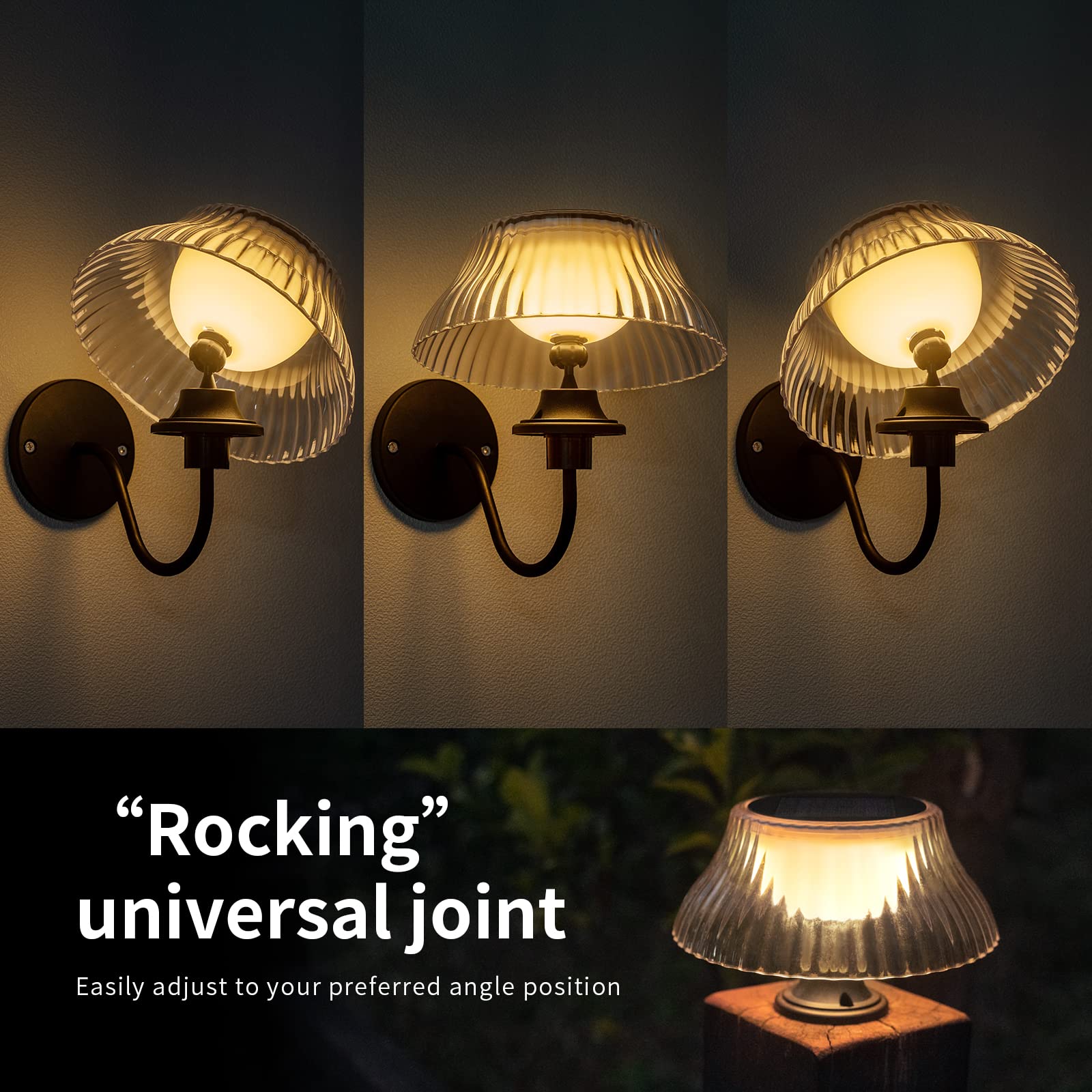 1.soalr powered - This light provides bright and efficient lighting with zero electricity costs, charging during the day and turn on automatically at night. 7-8 hours of battery life each night. 2.Unique Design - It prossesses distinctive features or characteristics.It is not only visually appealing but also original,creative and innovative. The wall light's design resembles a graceful dancer in motion,with its flowing lines and delicate curves,just like a skilled performer on stage.It features 360 degree rotatable head,allowing to adjust the direction of the light to best suit you need ,making it dieal for illuminating specific areas or casting light in multiple directions. 3.Bright - The newly upgraded LED bulb provides warm white lighting effect, combined with classic transparent mushroom shade, it’s much brighter than other solar lights. the solar lights are the perfect choice for outdoor lighting and decoration 4.Easy to install - Simple and easy to install, requiring no wiring,making it a hassle-free addition to your garden,patio,any wall,fence or post.Included necessary mounting accessories and User Mamual,making installation a breeze.. 5.Durable and Weather Resistance - Made from high-quality materials and its durable design that can withstand all types of weather, IP44 waterproof Plastic with UV fade protection,making it ideal for use all year round.