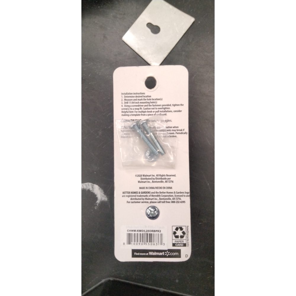 Better Homes & Gardens knob set comes in a rich oil rubbed bronze finish. Give your kitchen or bathroom a quick style update by simply replacing the cabinet hardware. Create an inviting modern farmhouse look by pairing the bold contrast of dark brown with soft whites or rustic woods. The simple minimalist design of the modern knob is perfect for any cabinet drawer or door. Modernize the look of cabinets or give a facelift to ordinary dressers desks armoires or other furniture. This knob measures 1-1/4 inches (32mm) in diameter and has a durable zinc construction. The package includes (2) cabinet knobs and (2) 8-32 x 1 inch mounting screws for a quick stress free installation. This contemporary style knob is also available in a 6 count pack or in an matte black finish. Assembled product dimensions are 1.26 in. L x. 1.26 in. W x 1.18 in. H. Model CHWM-KMO1.25ORBPK2.