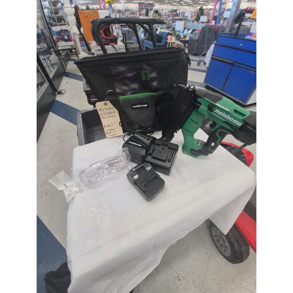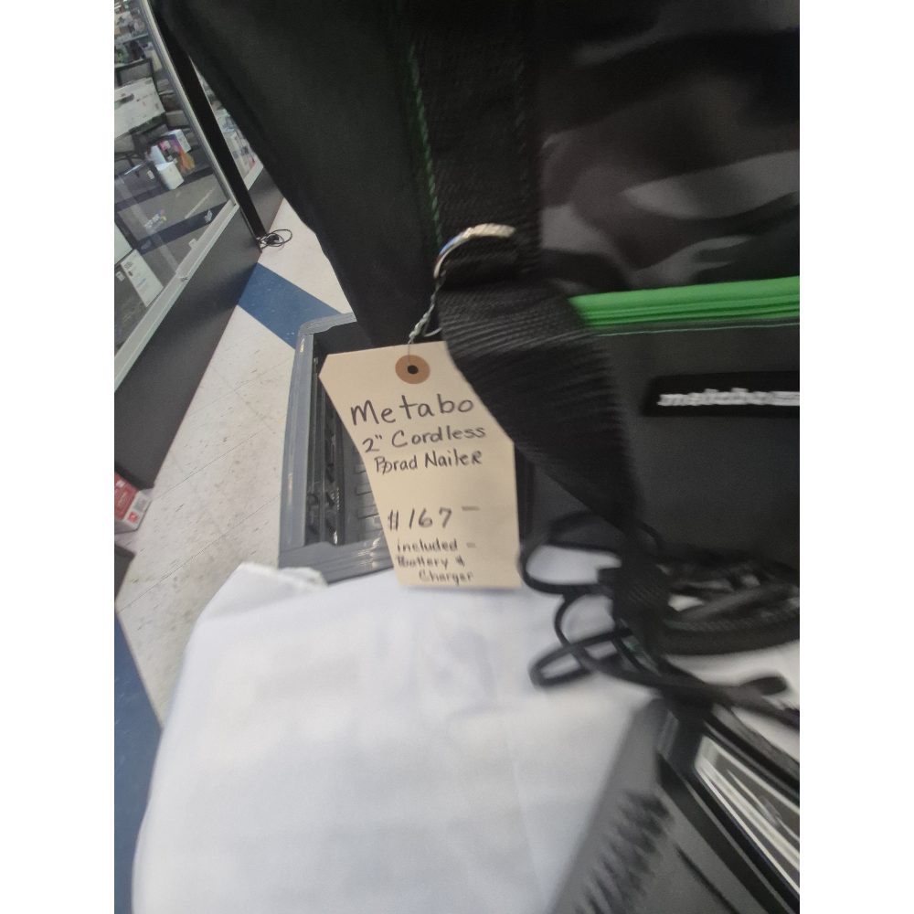 This is a Metabo 2" cordless brad nailer, known for its reliability and convenience on job sites.