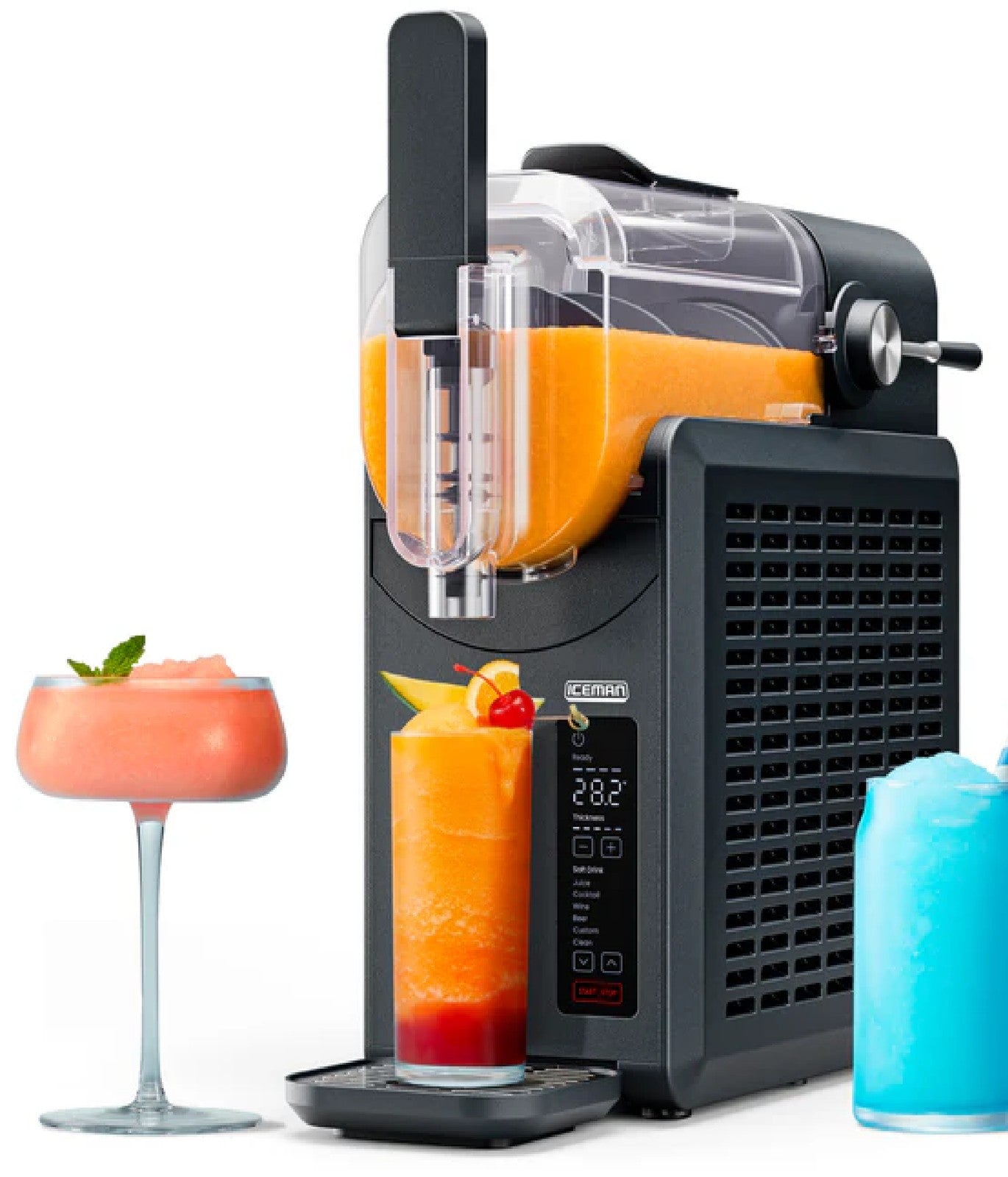 Chefman, RJ62-20A-BLK. No ice is needed, making it perfect for classic cherry slushies, frosé, frozen margaritas, and frappés. This one-touch drink maker freezes drinks quickly, so you can enjoy a cold and refreshing drink in just 20 minutes.