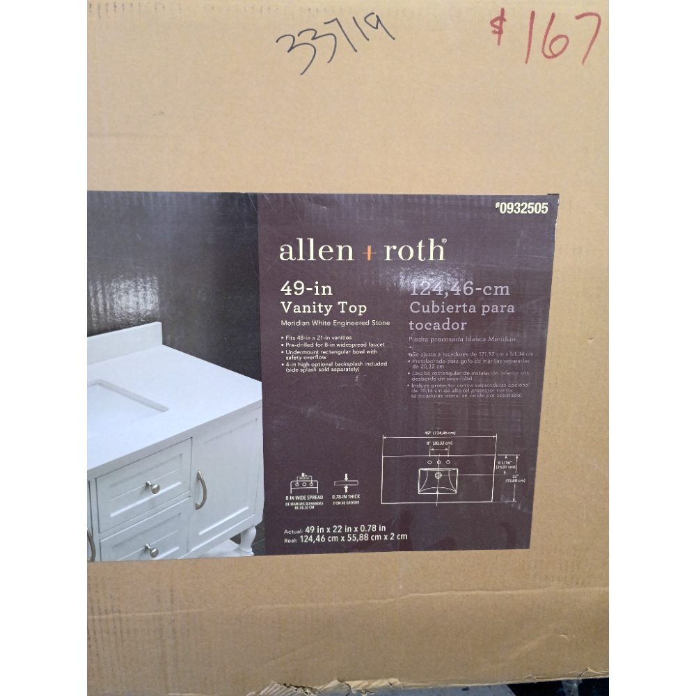 The allen + roth 49-inch vanity top in Meridian White engineered stone offers both elegance and functionality. Pre-drilled for an 8-inch widespread faucet and including a rectangular undermount bowl, it is designed to seamlessly integrate into your bathroom. The inclusion of a sidesplash and backsplash enhances its utility and appeal.