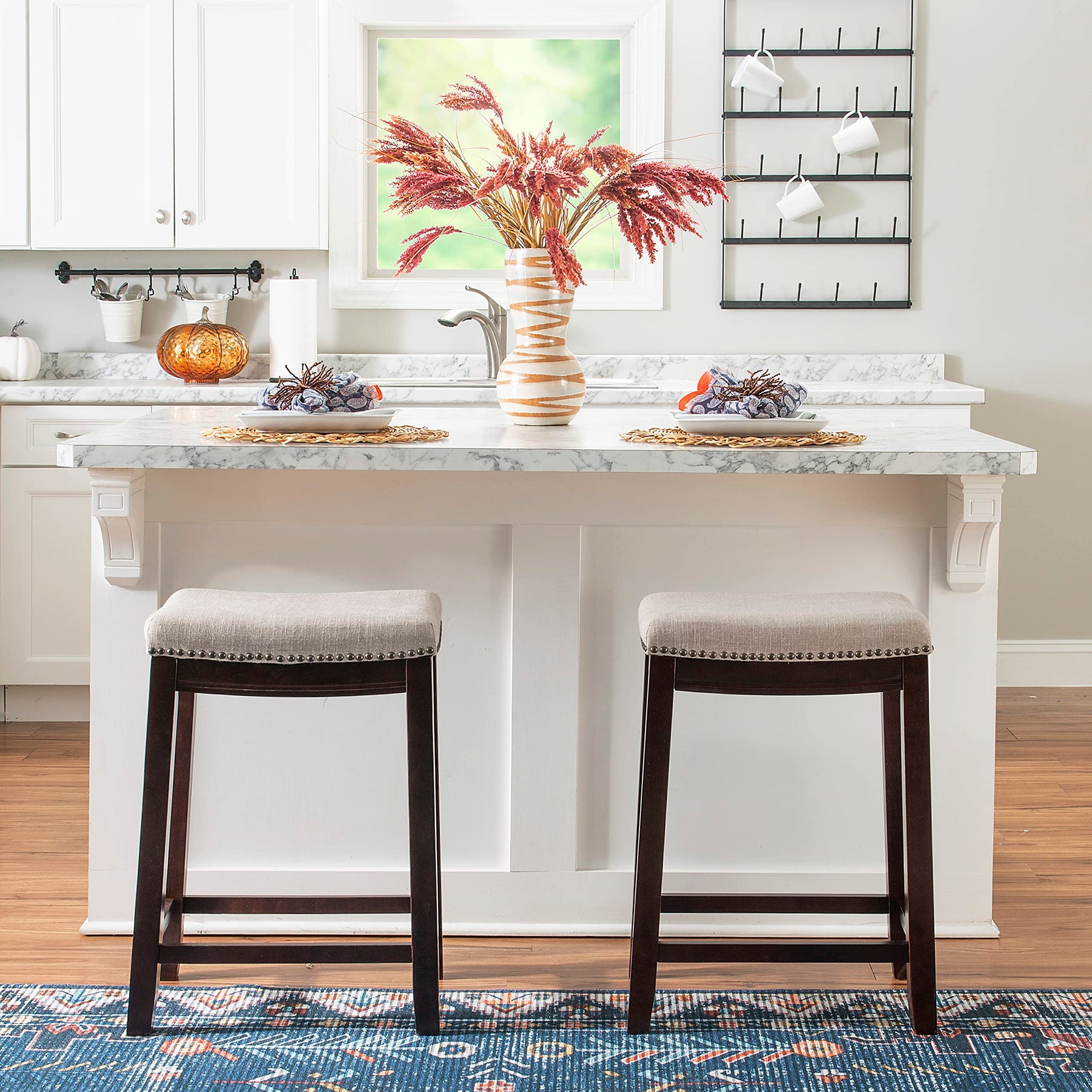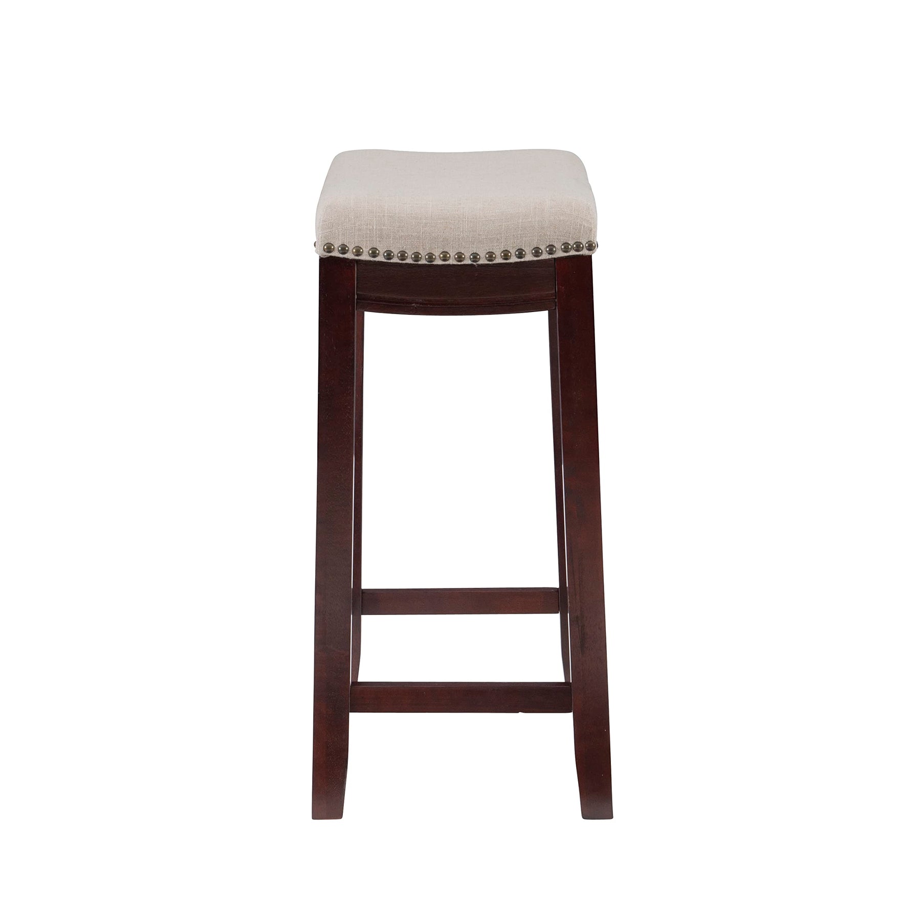 Dark Walnut Finish Beige Linen Upholstered Top Nail Head trim adds interest to the stool Plush cushioned seat 26.5" seat height - Perfect for Counter heights of 35" to 39" Assembled Size: 18.25" W x 12.62" D x 26.5" H - Weight limit of 275 lbs. Colors may slightly vary due to lighting conditions.