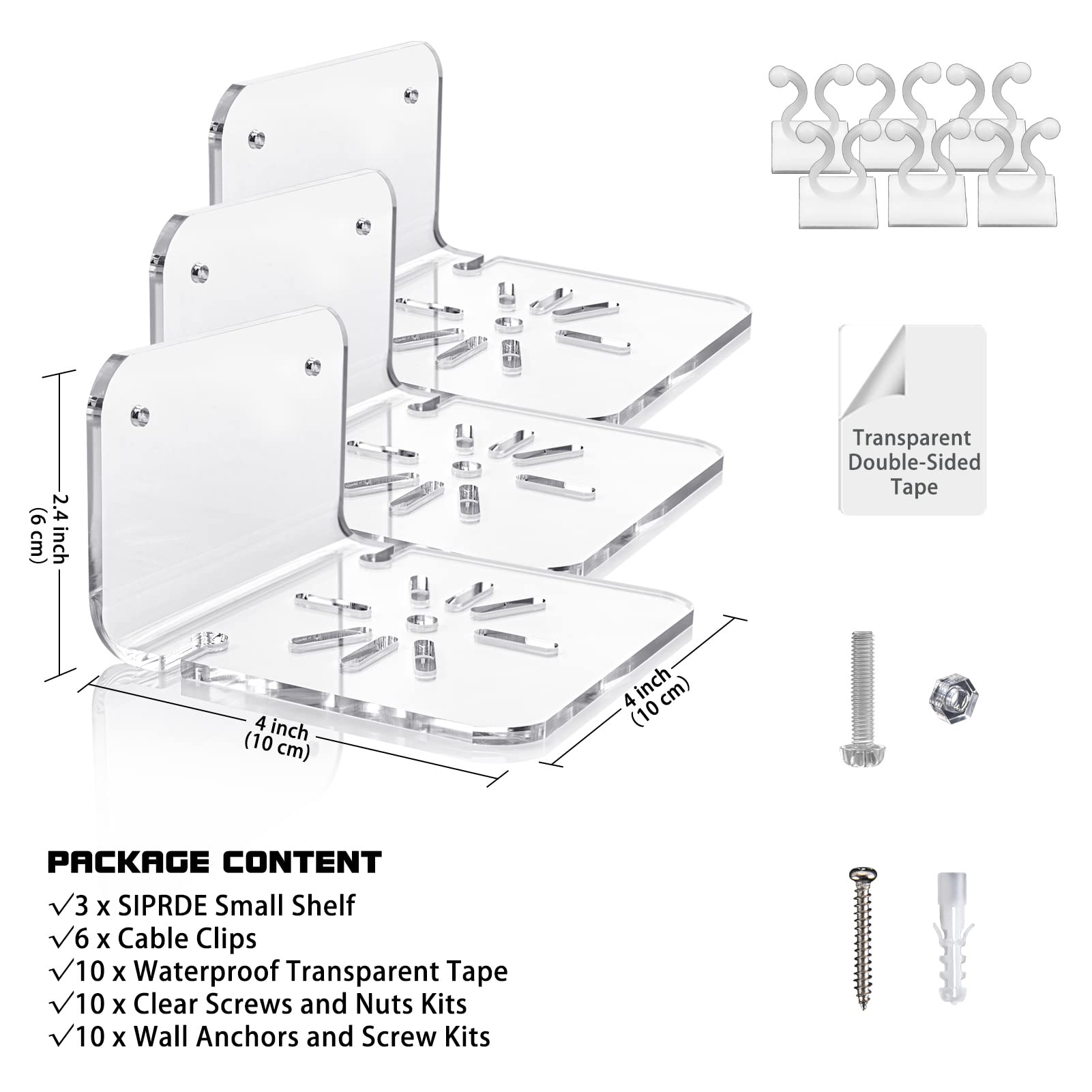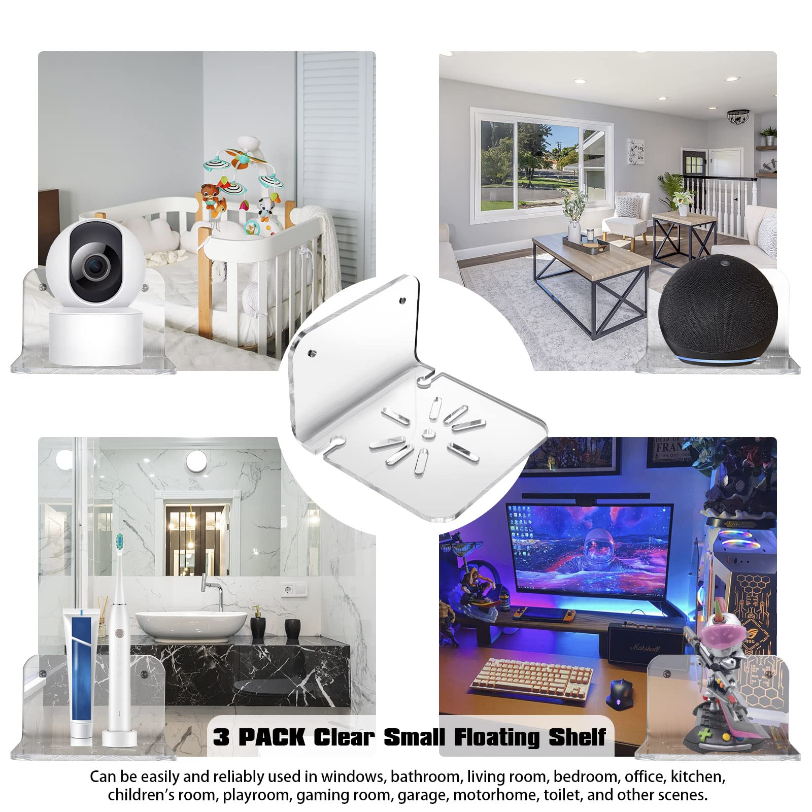 VERSATILITY: Contains 3 clear small wall shelf, keeps your cam exactly where you want. Made to accommodate baby monitors, security cameras, smart speakers, action figures, and other items. EASY INSTALL: Baby monitor wall mount is 2 installation methods, which can be easily and reliably used in windows, bathroom, living room, bedroom, office, kitchen, children's room, playroom, gaming room, garage, motorhome, toilet, and other scenes. PROFESSIONAL DESIGN: The small floating shelf is made of 0.15-inch-thick acrylic, with rugged and safe. The slotted design in the middle of the shelf increases aesthetics while providing the camera with the opportunity to enhance the fixing and reverse installation. Contains 10 clear screws and nuts. MINIMALIST STYLE: The speaker shelf has a beautiful appearance and complements your decorations. Hole design and cable clips form a suspension system to make the surface more beautiful and concise. Give away 6 cable clips stick on shelf to clean up cluttered cables. NO RISK PURCHASE: SIPRDE provides 24-hour response and solution customer service for each baby monitor shelf, If you care about style, quality, and versatility, SIPRDE mini shelf is the best choice.