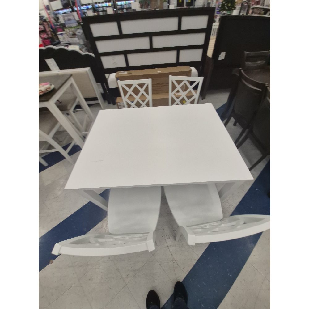 This stylish dining table set offers a modern and clean aesthetic, perfect for any contemporary dining space. The set includes a square table and four matching chairs, all finished in a crisp white color.retail price 424.00 features & Benefits: