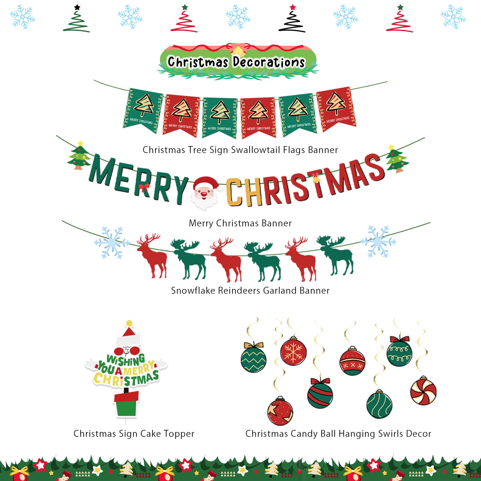 ???Package Include?- Christmas party decorations kit comes with 1pc 'MERRY CHRISTMAS' banner (Pre-Strung), 1pc reindeer garland banner (Pre-Strung), 1pc Christmas tree sign swallowtail flags (Pre-Strung), 1pc Christmas cake topper, 8pcs candy ball hanging swirls ornaments. ???Christmas Party Supplies?- Notely designed with classic cute Christmas elements characters, red green colors, Christmas tree sign, Santa and reindeer come together to make the home Christmas party more active and cozy, spending a wonderfully memorable Christmas party night. ??Easy to Assemble?- All the Christmas decors are made of premium paper card materials, durable and reusable. MERRY CHRISTMAS banner, reindeer garland, and Christmas tree swallowtail flags are all Pre-Srung, just hang where you want. Christmas candy ball hanging decors and cake toppers come with tools, easy to set up. ???Great Christmas Party Favors?- Great party decorations for Christmas new year celebration activities, like winter holiday decorations, Christmas family party events, school, office, bar X-mas festival celebrations, etc. Red green Christmas decorations could perfectly match the party, adding an active festival atmosphere for your Christmas party. ???Satisfied Services?- Your satisfaction is our priority. If there's any issue with the item you received, pls e-mail us. We'll free-hassle for you to resolve it with a replacement or arrange a refund. Wishing You a Merry Christmas!