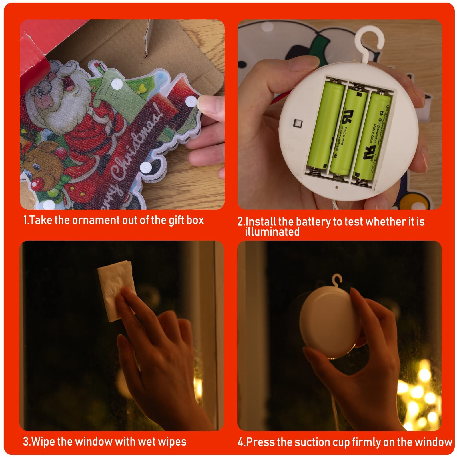 One Piece Design: Amazing lighted window silhouette with warm white lighting, creating you a kind of warm and festival mood. Hang the lights on your window or door and make your window or door decorations sparkling Battery Operated: 3 AAA battery required for this Christmas light up silhouette for window, the working time depends on the battery quality, for battery replacing, just slide out the battery door on suction cup hook and match the polarity in battery compartment 3 in 1 Gift Lights: With the classic Santa Claus, Christmas tree and Merry Christmas, no extra bore and doubt on gift choosing, these reusable festival decor lights will be the first choice as the best wishes for family, friends, relatives or colleagues Suction Hanging: Attach the suction cup hook to the door, glass window, or smooth ceramic wall with proper force, use the 3M sticker for fixing the Christmas window decoration lights, make sure it is fixed firmly enough, using the hook on suction cup hook is recommended, nice interior decor for cars too Practical Applications: This double sided Christmas silhouette lights decorations can be hung on door, porch, corridor, balcony, roof edge, bedroom, mantelpieces, fireplace side, centerpieces, Xmas tree, wreath, garland, banister, handrail, hallway, deck, patio, pub, bistro, cafe, bar, restaurant, mall, office, private cars