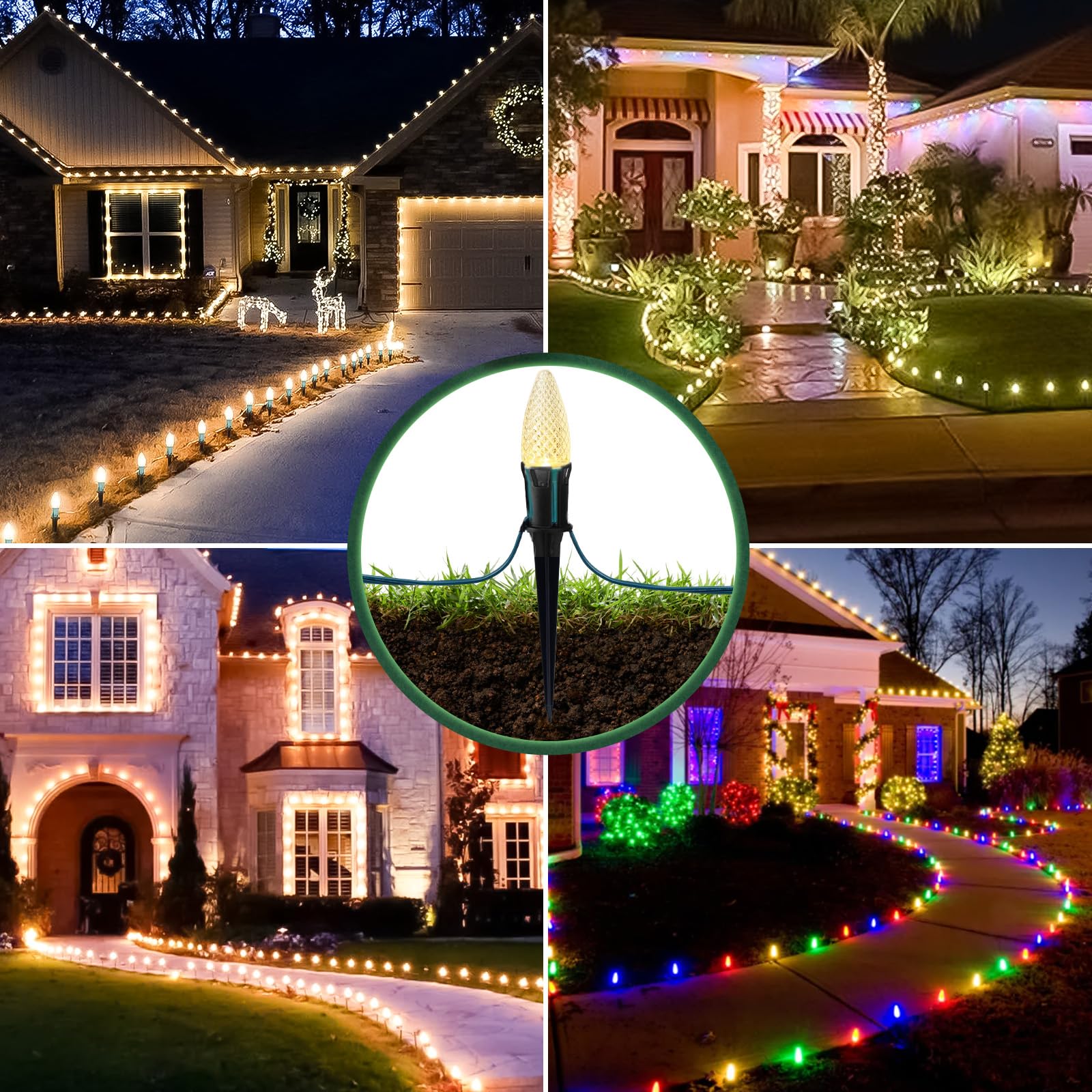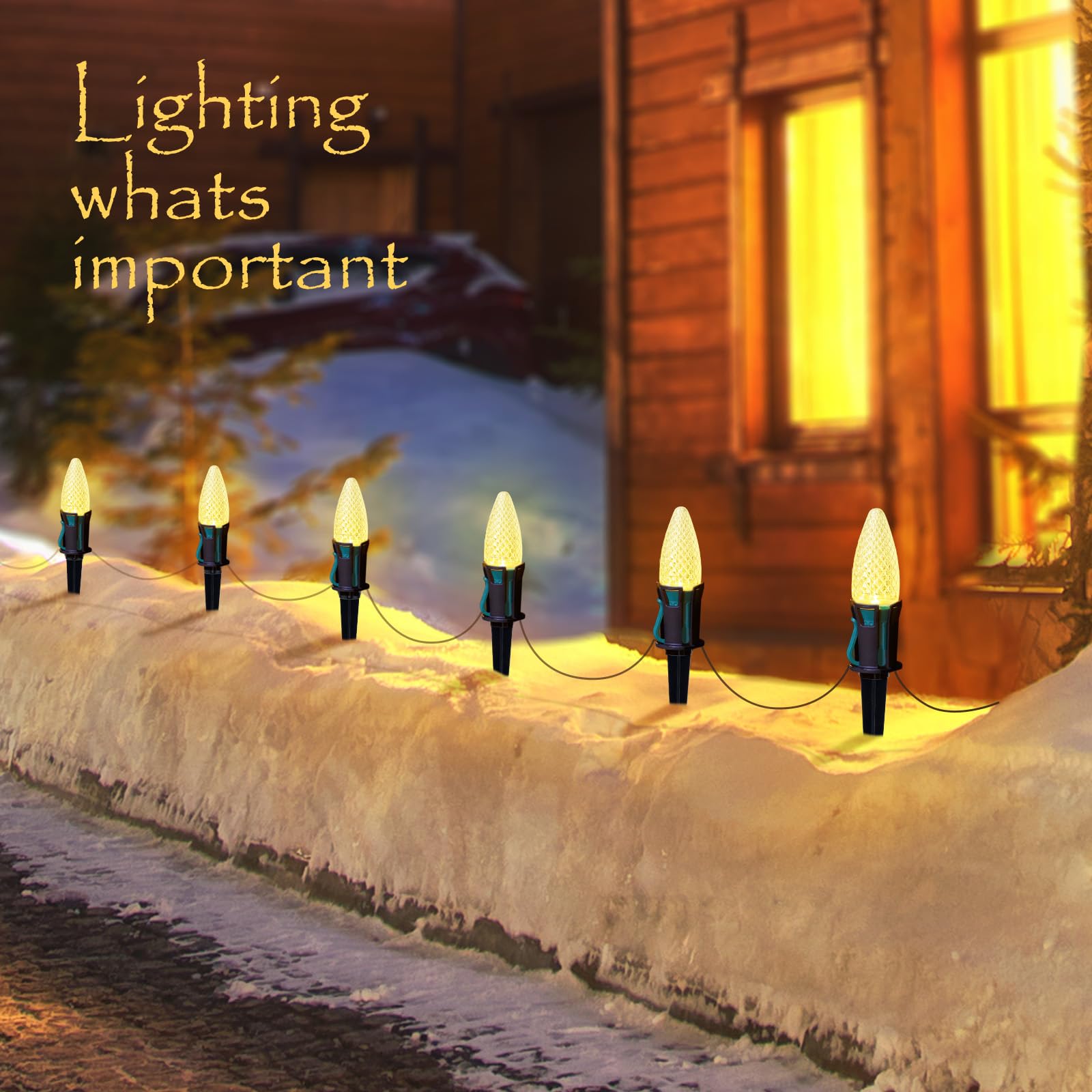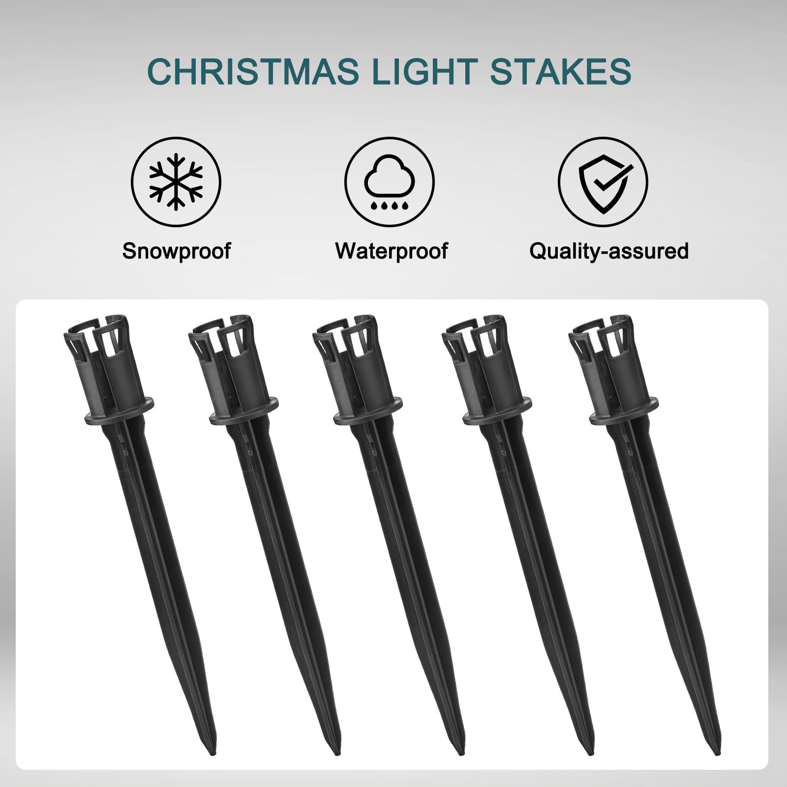 Universal Lawn Stakes: 7.5-inch plastic light stakes designed for C7 C9 Christmas light string. Add holiday brilliance to your yard and lawns. Brighten your walkways with lovely lights and these universal light stakes No Tools Required: No additional tools are required. Simply screw the bulbs indoors then head outside to stick them on the ground. These lovely stakes keep your lights shining brightly Durable and Weatherproof: Made from quality-assured plastic material, these light stakes won’t bend or break when inserted into the ground. And they perform well in all sorts of weather without snap, crack, rust, corrode, or stain, ideal for outdoor or indoor use A Nice Snug Fit: 4 notches on the head of the stake allow threading the wires easily. The suitable length makes them don't shake, standing straight like little soldiers in a row. And the bulbs remain steadfastly attached. Perfect for your outdoor yard decor. No need to worry about the strong wind blowing Wide Decorative Use: Not only for C7 C9 Christmas lights, but also for strings of green for Saint Patrick’s Day, red for Valentine’s Day, or just illuminating your place all year round. Recommend to use with light sockets that have a flat surface to fit flush against the stake