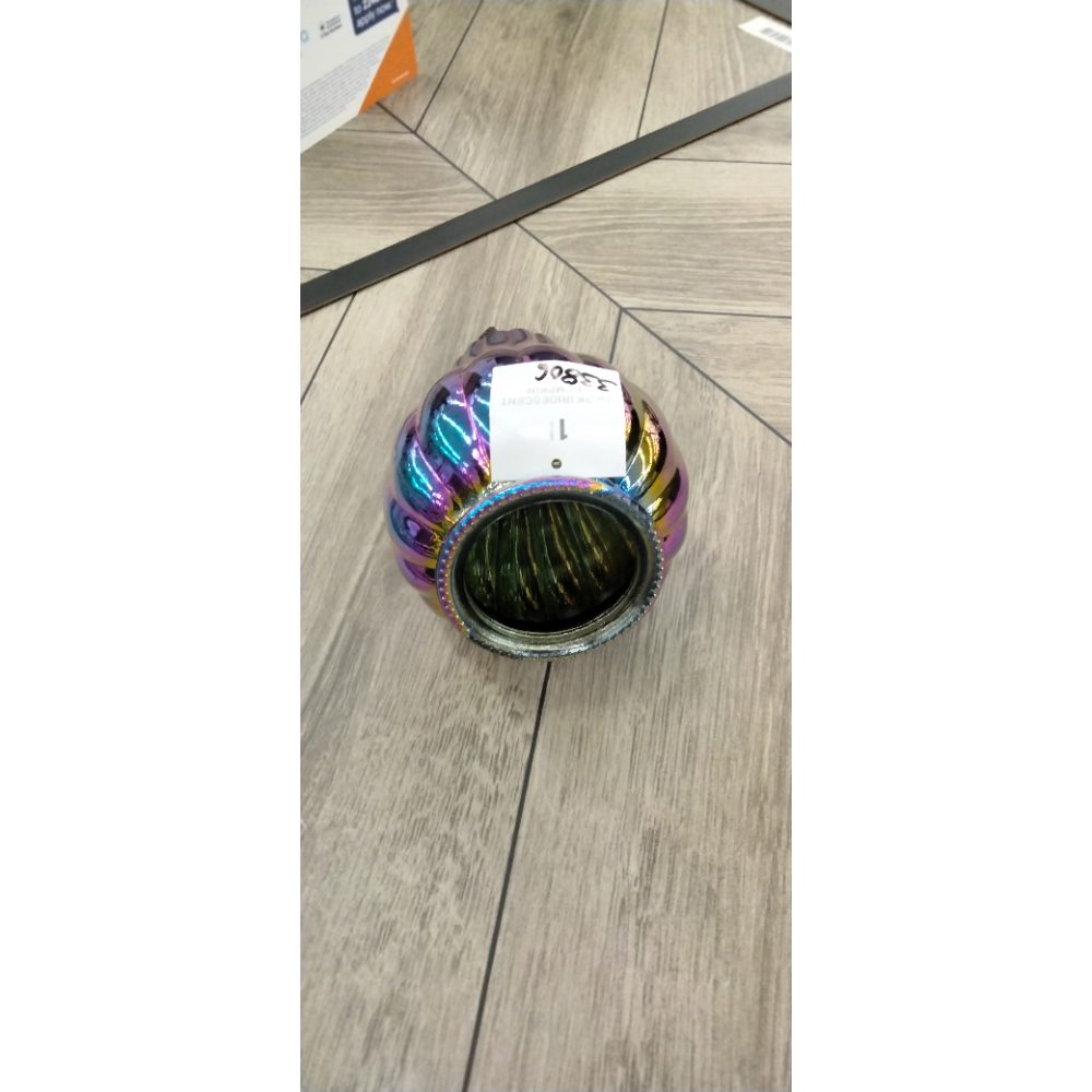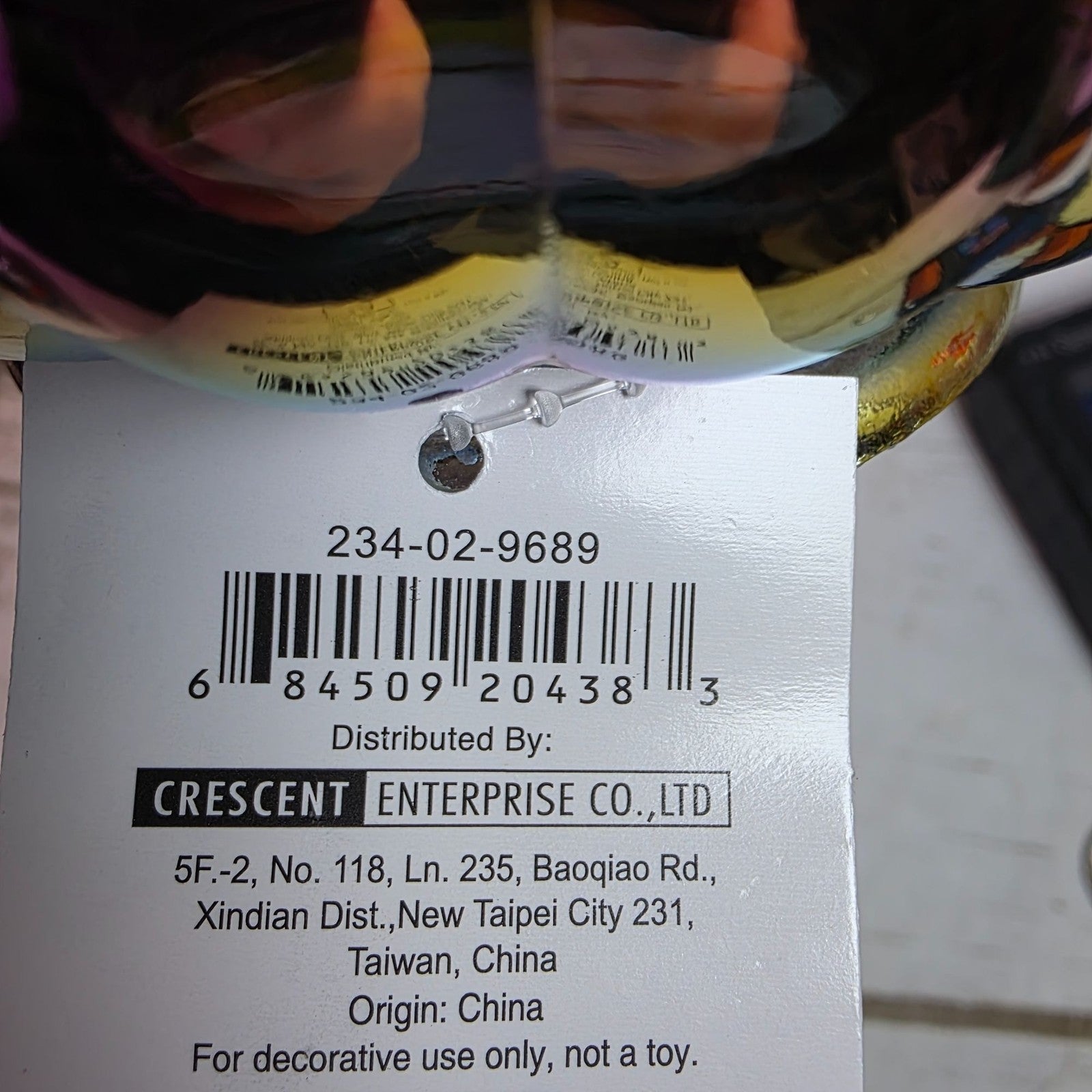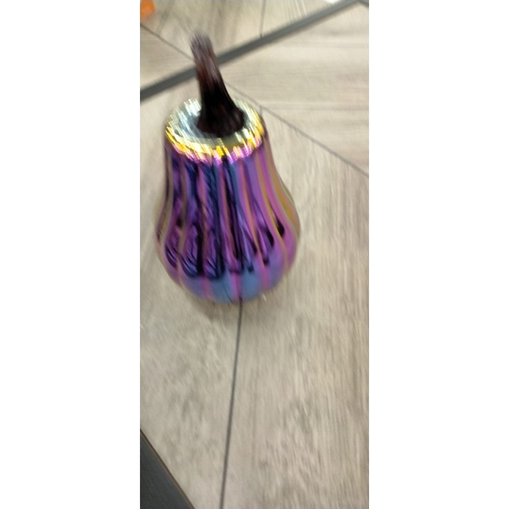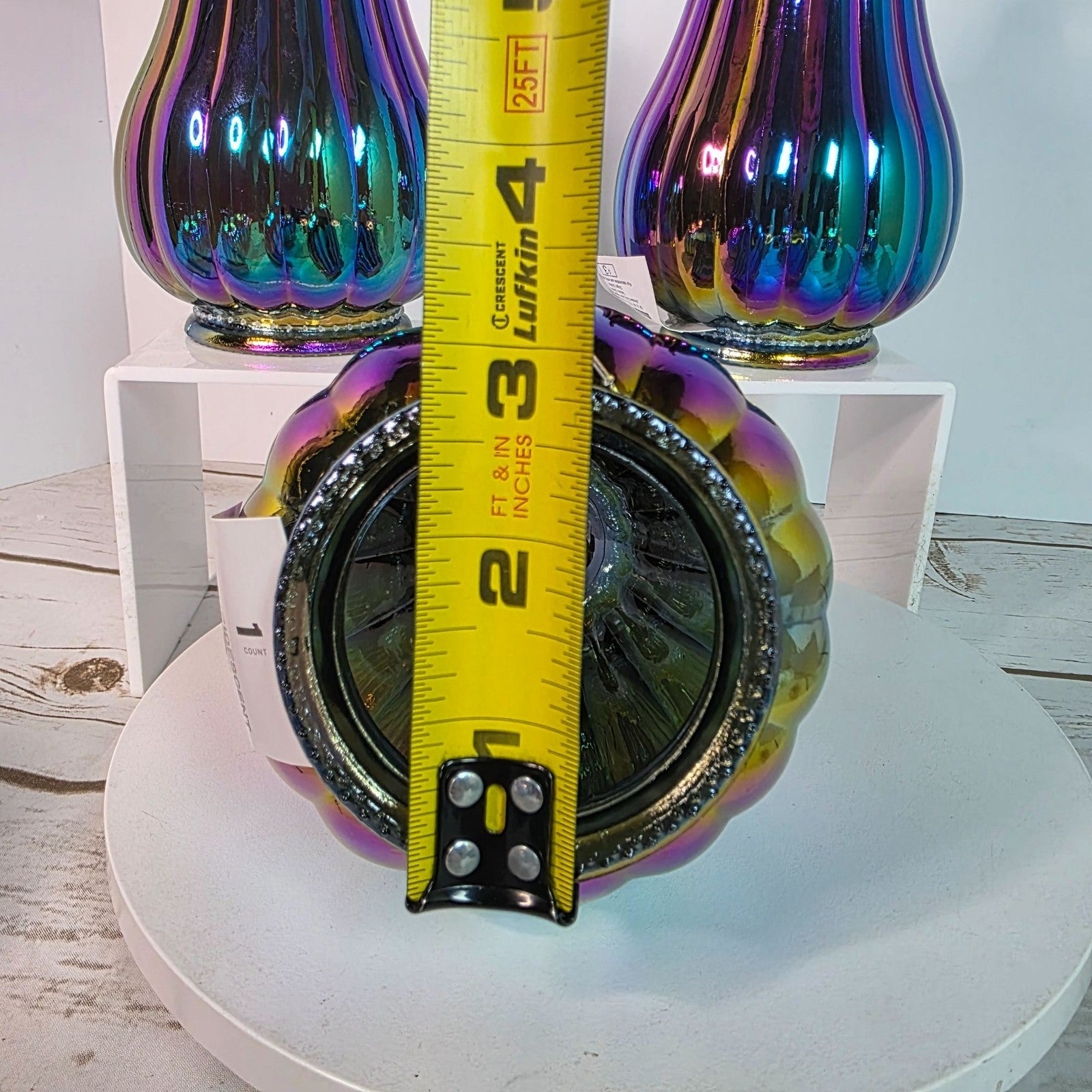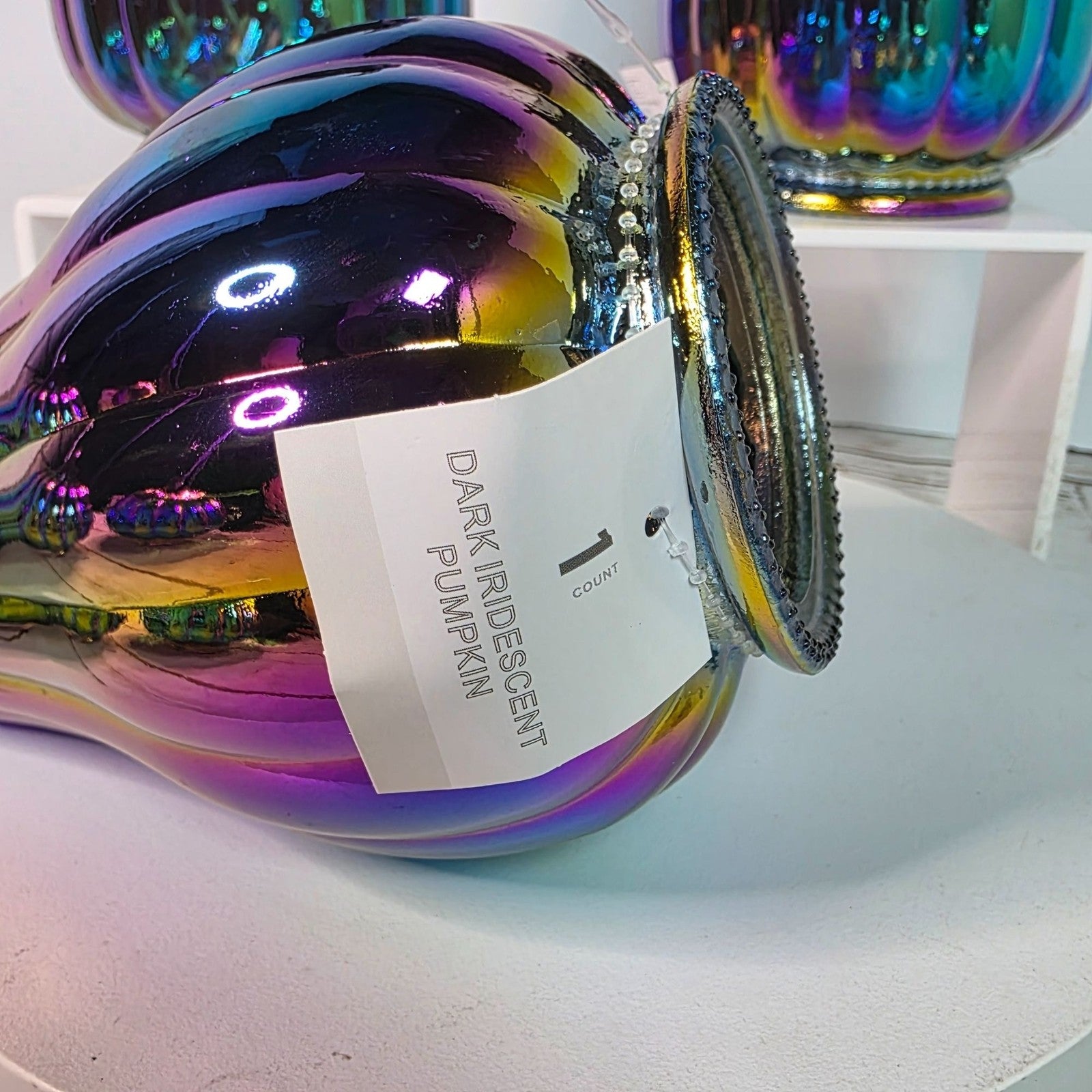 Enhance your Halloween decor with these dark iridescent pumpkins and gourds. Their shimmering surface adds a spooky yet elegant touch to your seasonal display. • Includes 6 pieces: 3 pumpkins and 3 gourds • Made of durable iridescent glass • Approximate height of each piece: 5 inches • Not suitable as toys or for food use No visible condition flaws. Height = 5 inches, Diameter = 3.5 inches - Pumpkin Height = 7 inches, Diameter = 3.5 inches - Gourd.