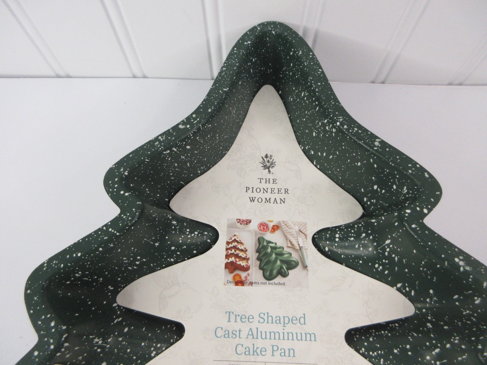 The Pioneer Woman Tree Shaped Nonstick Cast Aluminum Cake Pan, Green & White Speckle. Nonstick interior for easy release and quick cleanup. Crafted from cast aluminum for excellent heat conduction and even baking.