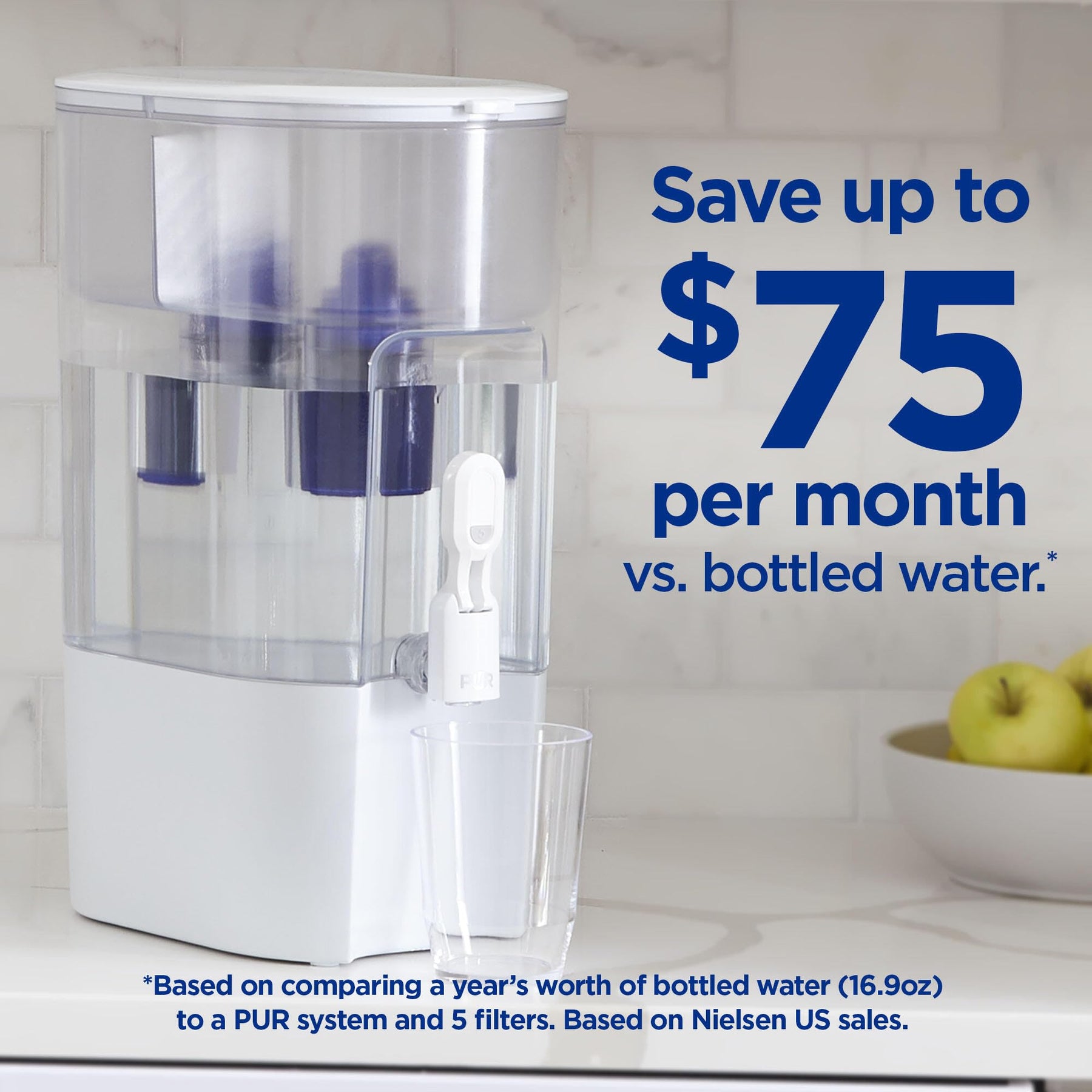 2-in-1 POWERFUL WATER FILTRATION for better tasting drinking water. The PUR XL 44-Cup Water Filter Dispenser is NSF certified to reduce chlorine, mercury, copper and zinc that cause bad taste and odor in your drinking water. § DISHWASHER SAFE, HASSLE-FREE DESIGN -- This 44 cup dispenser features a slim, space-saving design for less room in your refrigerator, a pull-down spout for easy pouring, a carrying handle for easy refill, plus it's dishwasher safe for easy cleaning. FILTER INDICATOR LIGHT to notify you when it is time to change your water filter. Each Genuine PUR Dispenser Filter is certified to last for up to 40 gallons or for 2 months of regular use. REMOVABLE STAND TO STORE UP TO 6 GENUINE PUR DISPENSER REPLACEMENT FILTERS. Compatible does not mean comparable – Genuine PUR water dispenser filters are certified to reduce 15 plus chemical & physical substances from your tap water and are the only filters certified for use in the PUR XL 44-Cup Water Filter Dispenser. SAVE MONEY WITH A BRAND TRUSTED FOR OVER 35 YEARS. The PUR PLUS 30-Cup Water Filter Dispenser can help you save up to $75 per month compared to bottled water.