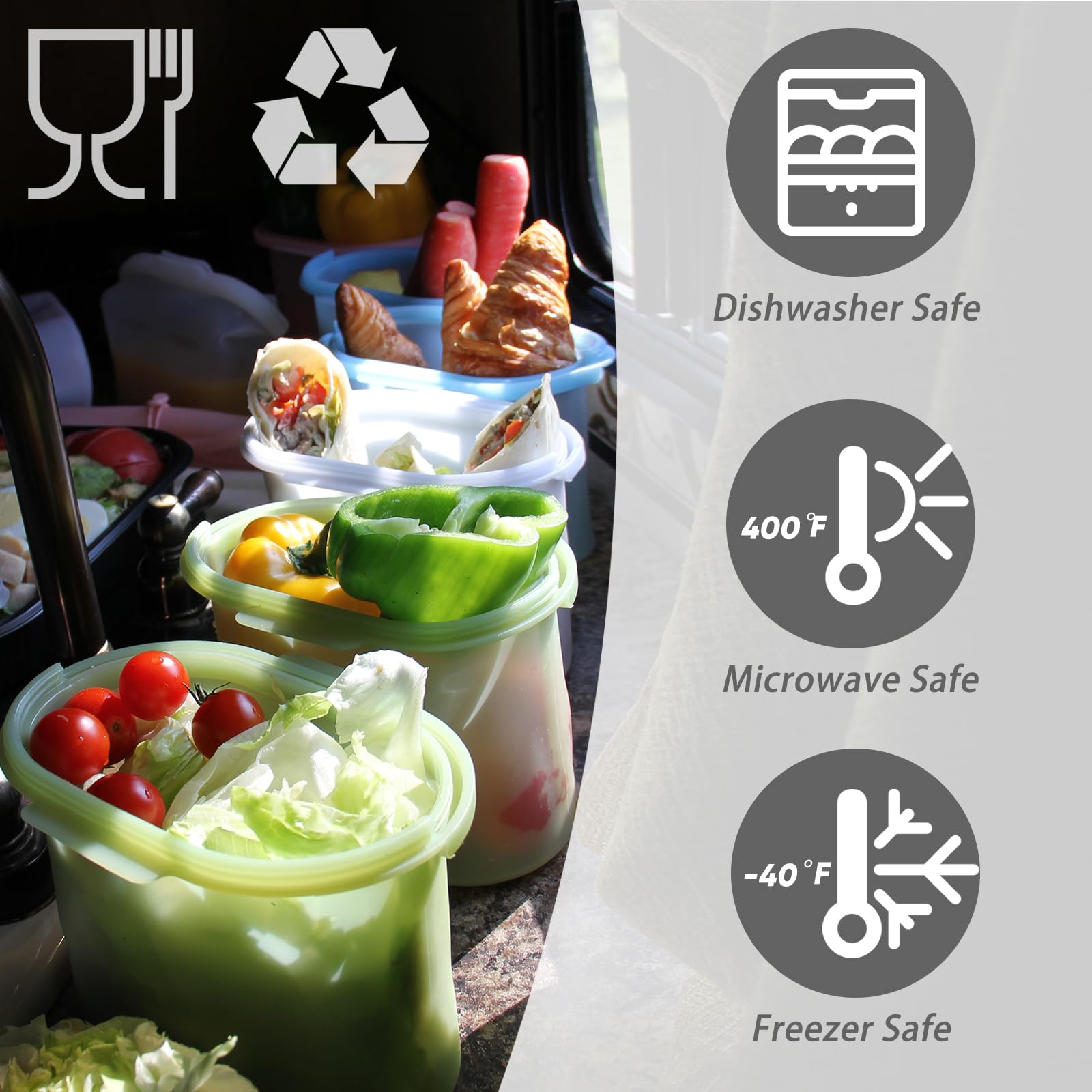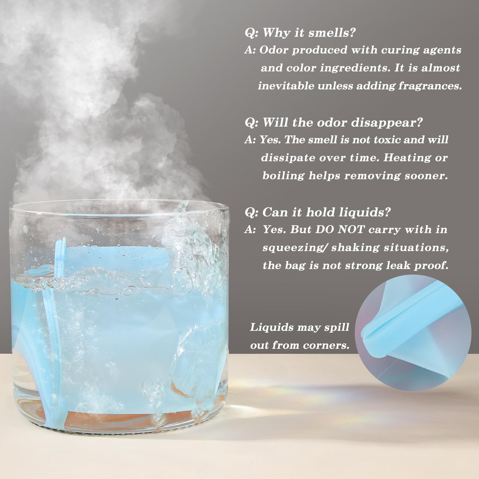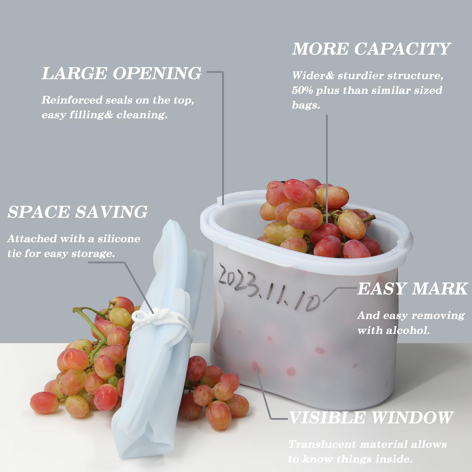 SAFE MATERIAL- Made of thicker food grade silicone, reusable and secure for multiple purposes. LARGE OPENING-Reinforced oval shaped seals at top, will stay open when filling/ eating/ cleaning, also keep tight closed when sealed, not easy to pop open, better user experience. MORE CAPACITY- Improved opening with large flat bottom and thick walls, sturdy stand up form, thus expanding the effective capacity, more usable space than usual bags of similar sizes. EASY STORAGE- An extra silicone tie for space saving while not in use, great for both indoor and outdoor activities, like RVing, camping,etc.. SEALING TIPS- Start from the middle part to the sides, press tight the corners. Or stretch the seals and close the corners first, snap close the rest.