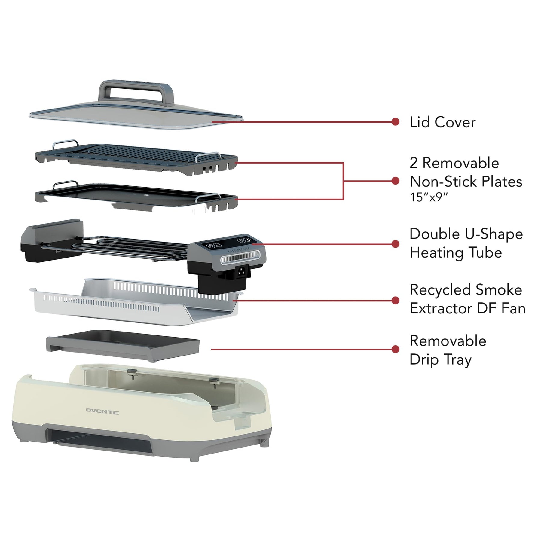 OVENTE Smokeless Indoor Grill, 1500W Electric Portable Korean BBQ Grill with One-Touch Control, LED Smart Display, Tempered Glass Lid, Two Removable Non-Stick and Dishwasher Safe Plates, White SGR85W