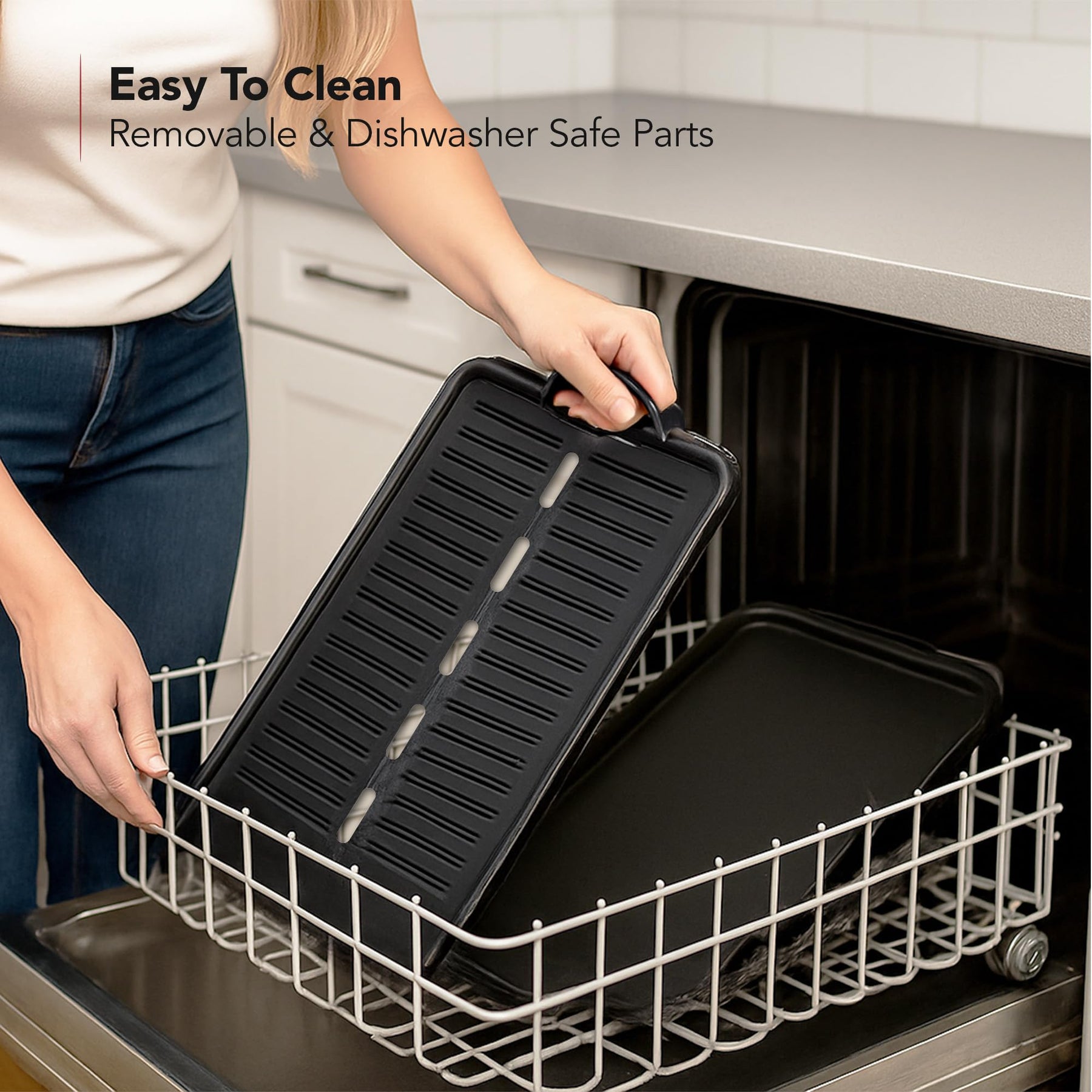 • CONVENIENCE AT ITS FINEST – Food slides right off the non-stick surface, making cleanup a scrub-free experience! Whether you wash by hand or in the dishwasher, the non-stick plates, glass lid, and drip tray are all removable, saving you time and ensuring a hassle-free cleanup. Plus, the base detaches and nests for compact storage, making both storage and cleaning even easier.