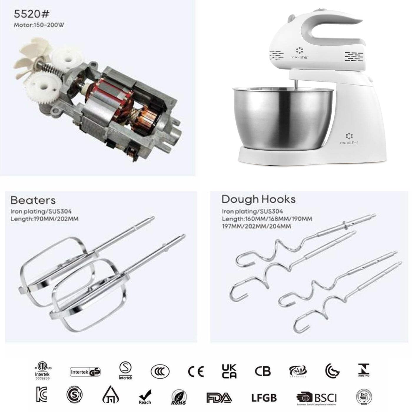 • True Power & Efficiency: Real 150W motor outperforming products labeled with higher wattages thanks to advanced engineering. • 5-Speed Settings: Provides flexibility to mix, beat, and knead with precision. • 3.2 Quarts Stainless Steel Bowl: Spacious bowl for preparing larger quantities. • Beater Ejection Button: Facilitates easy removal of beaters and dough hooks. • Safety Certified: ETL certified for safe use in the USA.