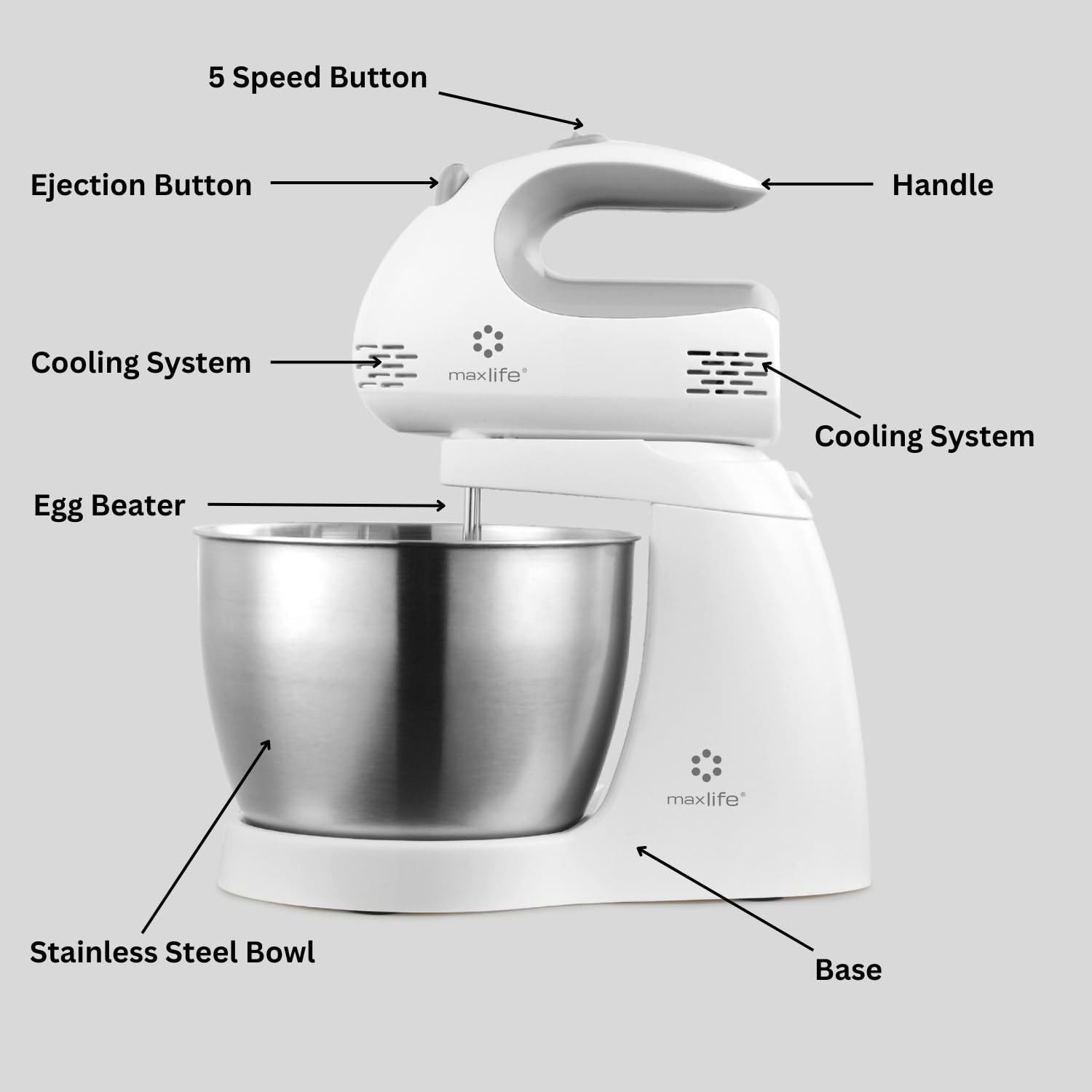 Max Life 3.2 Quarts Stand Mixer - 5-Speed Electric Powerful Stand Mixer, White, with Stainless Steel Bowl, Dough Hooks, Beaters,