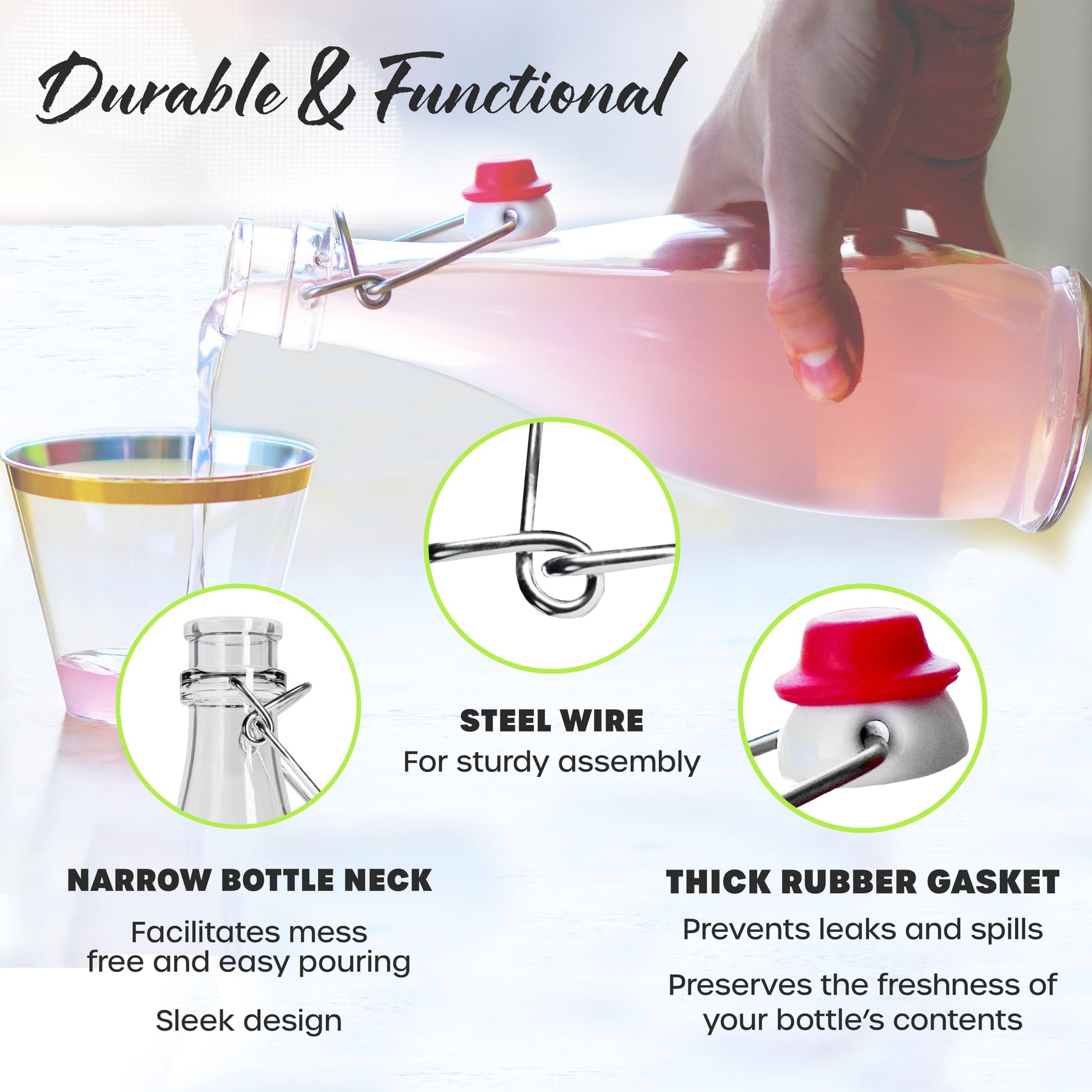 • SWINGTOP GLASS BOTTLES FOR LASTING USE: Built with a focus on excellence, our small swing top glass bottles feature rust-proof steel closures for robustness against impacts & temperature. The resealable glass bottle is not only sturdy but sustainable, thanks to the solid glass bottle for syrup construction. When the closure is removed, the 250ml glass bottle is dishwasher safe, so you can use this glass bottles small set again & again. Replace flimsy plastic with our flip top glass bottles .