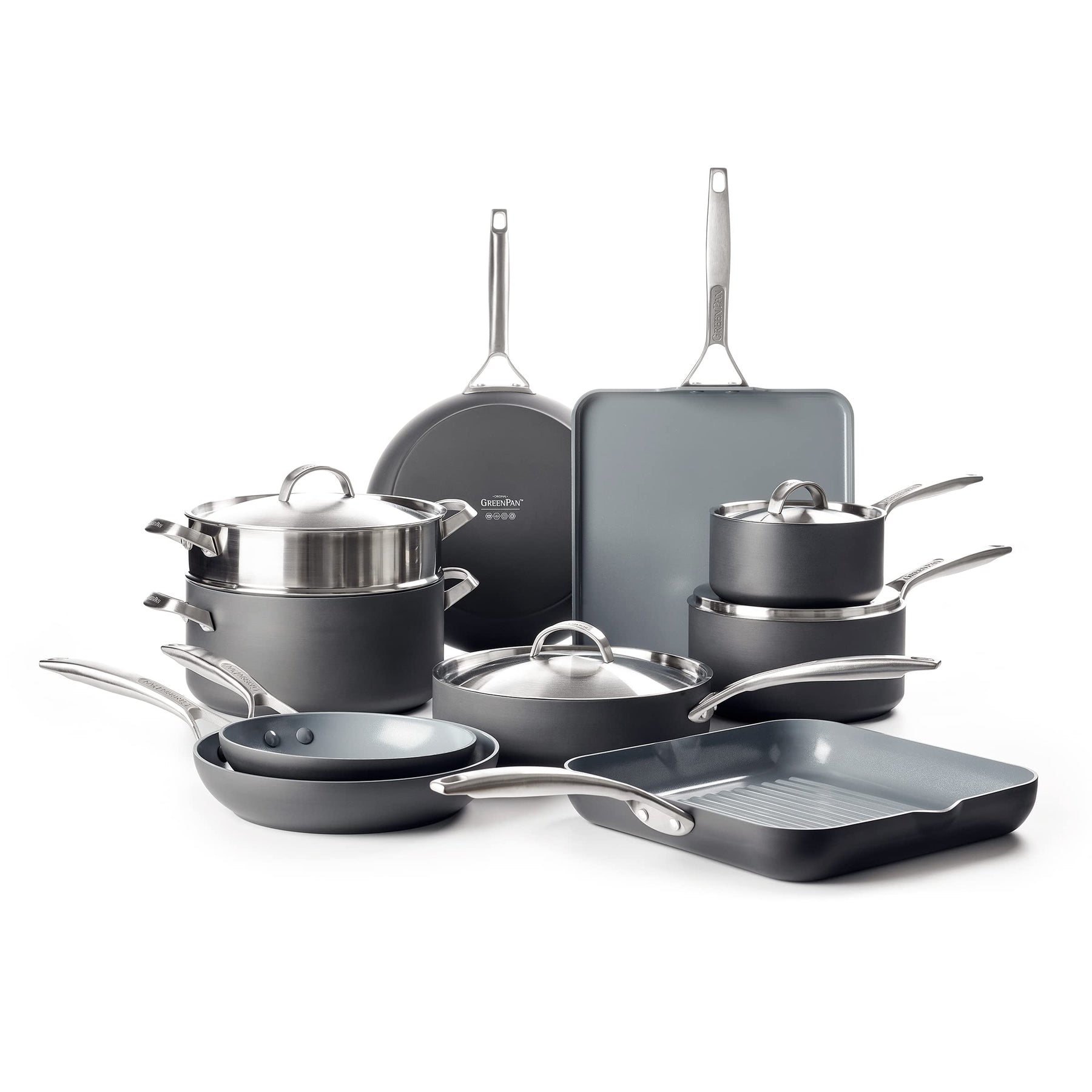 Cookware Set Includes: 8”, 9.5”, and11” frypans; 2QT and 3QT saucepans with lids; 3QT skillet with lid; 11’’ griddle; 11’’ grill pan; stainless steel steamer; and 5.5QT casserole with lid GreenPan’s Thermolon healthy ceramic nonstick coating is free of PFAS, PFOA, lead, and cadmium, so it will never release toxic fumes, even if it’s accidentally overheated Metal utensil safe, this collection's diamond-reinforced coating is incredibly durable Tough Hard Anodized bodies are scratch-resistant and designed to stand up to daily demands Oven and broiler safe up to 600°F Dishwasher safe for easy cleanup Durable stainless steel lids are oven safe up to 600°F Riveted stainless steel handles are contoured for a relaxed and comfortable grip Suitable for all stovetops except induction