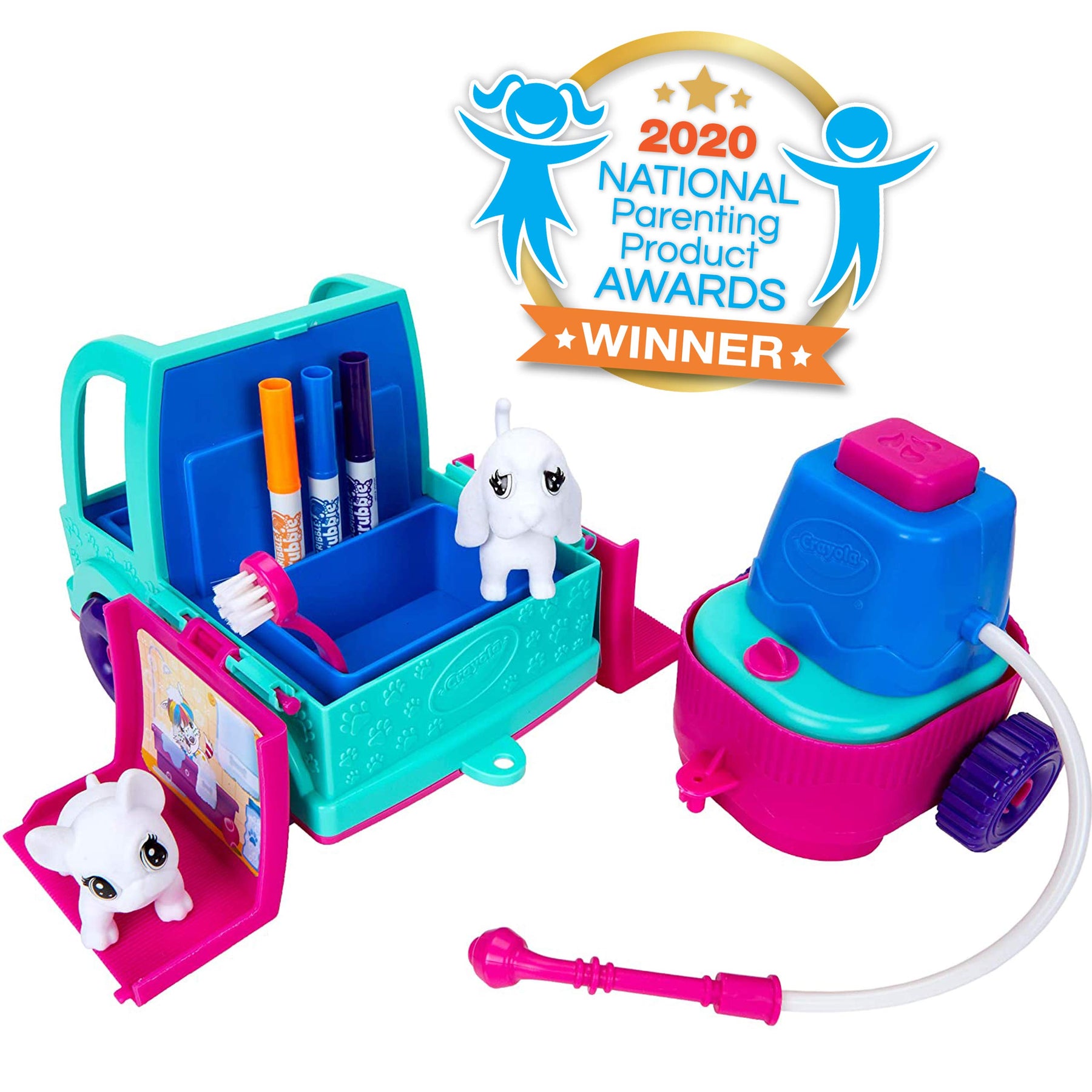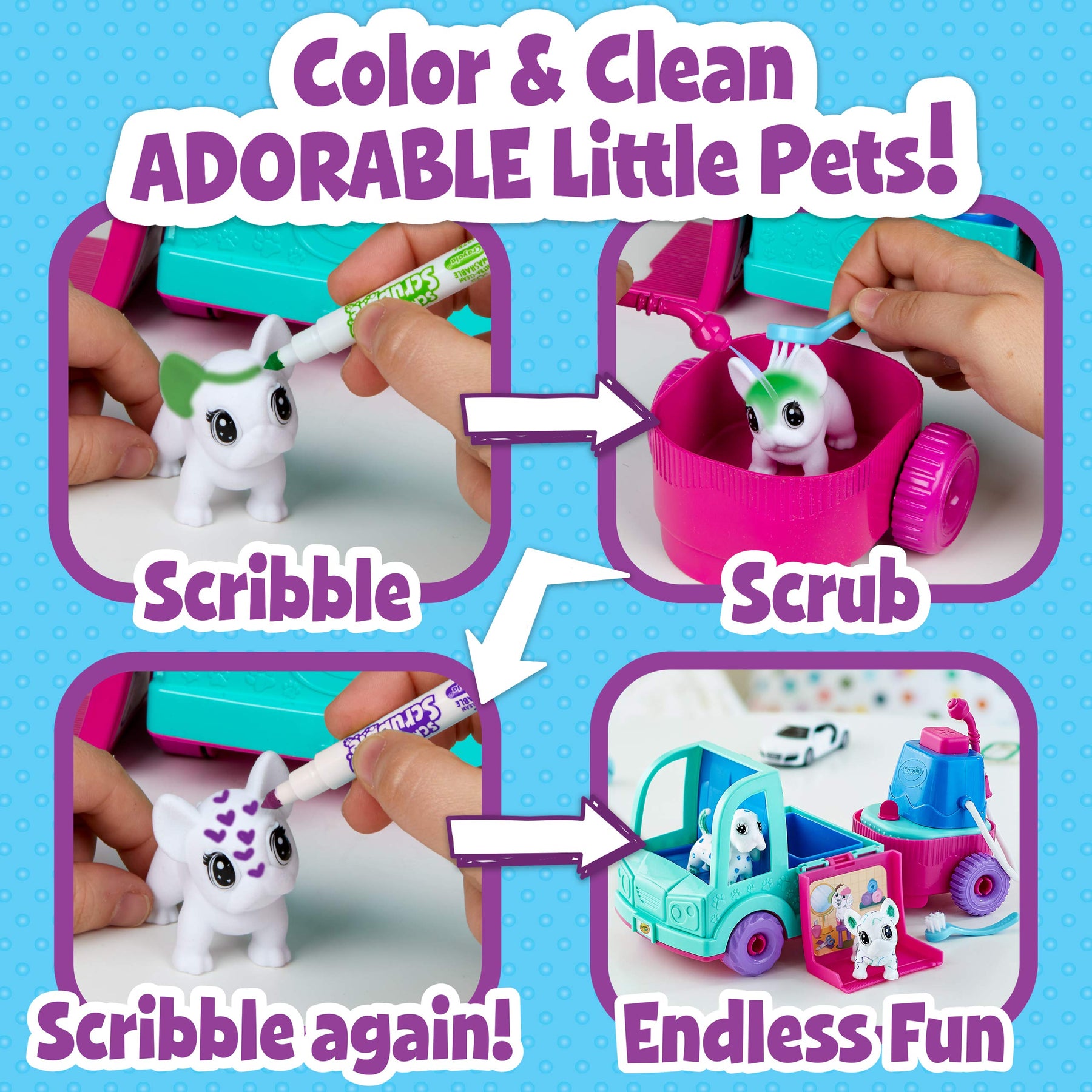 SCRIBBLE SCRUBBIE GROOMING TRUCK: Includes 1 Toy Truck, 2 Scribble Scrubbie Pets, 1 Spray Pump, 1 Detachable Cart, 3 Washable Markers, and 1 Scrub Brush. COLOR, WASH, PLAY: With 3 washable markers, color & customize your pets, then scrub & start again! PET CARE TOY: Giggles abound with gentle grooming and bath time fun using the included brush. PLAYTIME ON THE GO: This mobile playset allows kids to care for their Scribble Scrubbie pets on the go - just fold it up and roll out! GIFT FOR GIRLS & BOYS: Scribble Scrubbies make a perfect gift for bright, creative kids ages 3 and up. GROW YOUR COLLECTION: Mix, match and grow your colorful Scribble Scrubbie collection. Collect them all! GENERAL NOTE: We suggest using only Crayola Ultra-Clean Markers for your Scribble Scrubbie Pets.