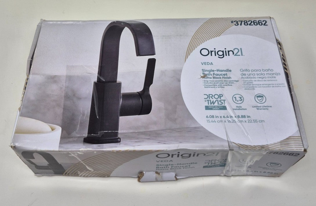 The Allen Roth Veda Matte Black Single hole 1-handle WaterSense High-arc faucet is designed for bathroom sinks, featuring a sleek black matte finish and a high arc design for added space during use. With a single lever handle for easy operation, this faucet is WaterSense certified, ensuring water efficiency while maintaining a stylish look.