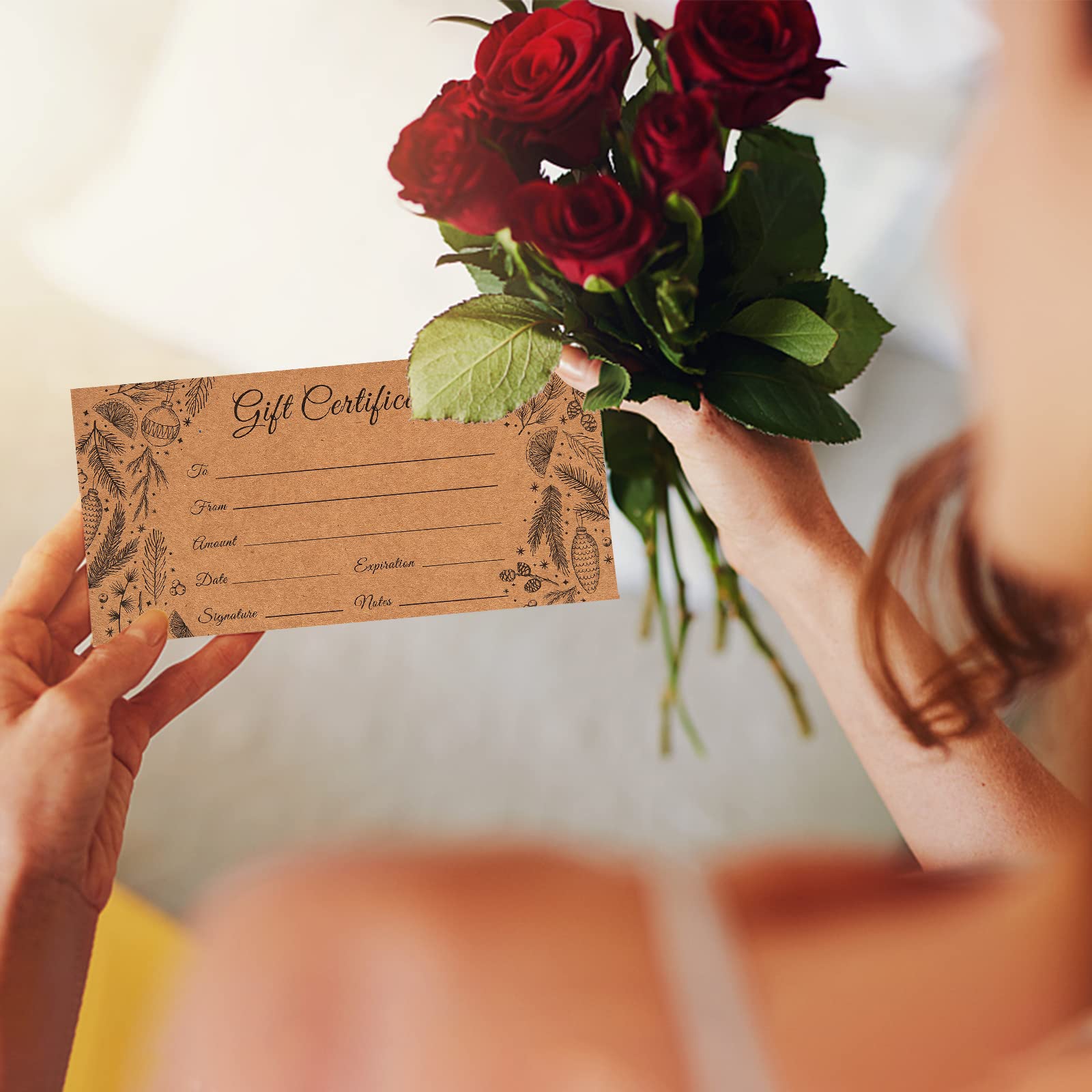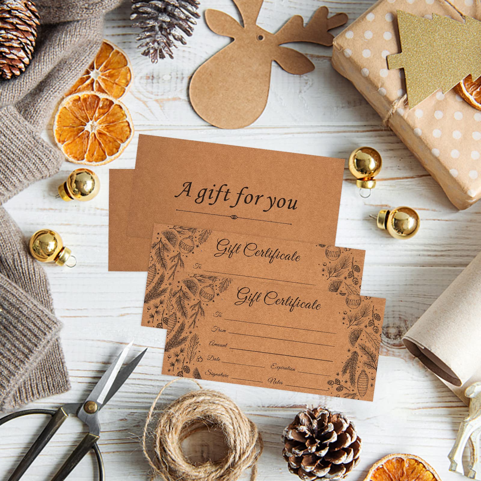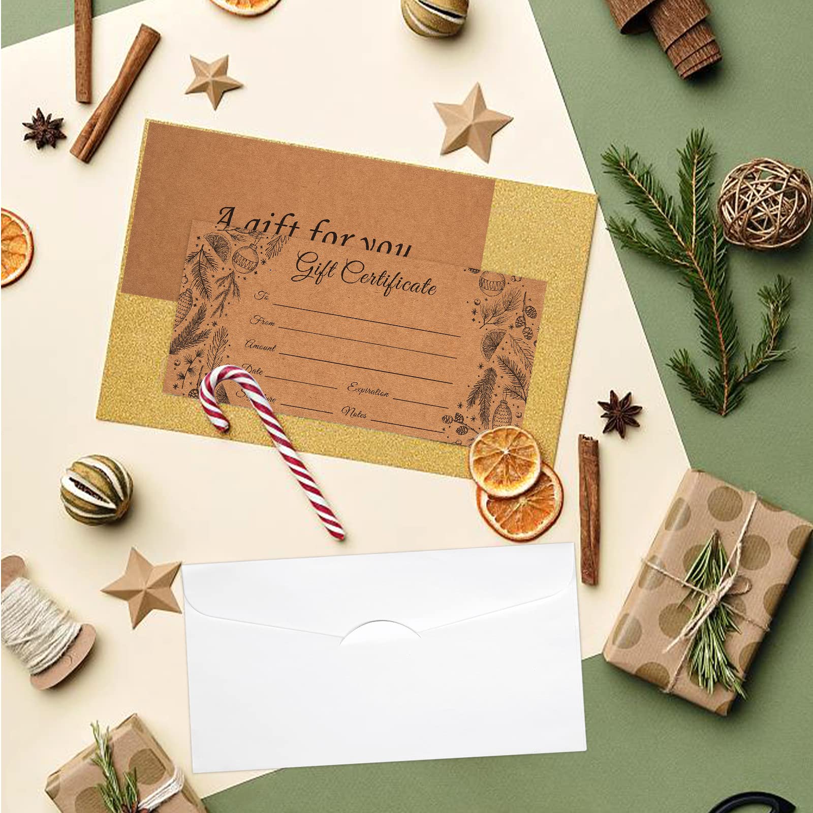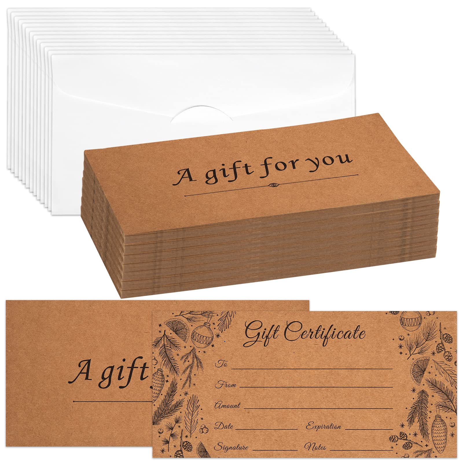 50 Sets Blank Gift Certificates with 50 Envelopes, 3.75 x 7.5 Inches Kraft Gift Certificate Cards, Paper Vouchers for Small Businesses, Holiday, Beauty Bars, Restaurants (Style 1)