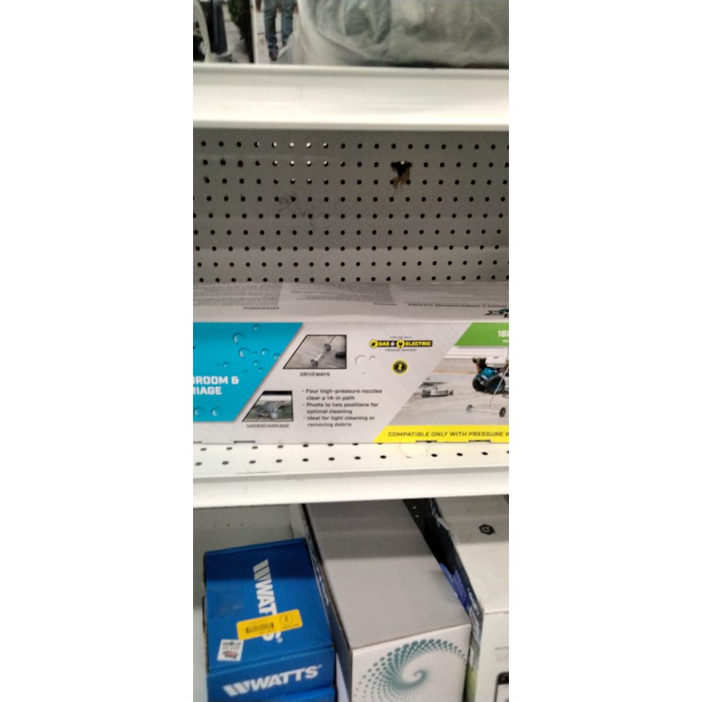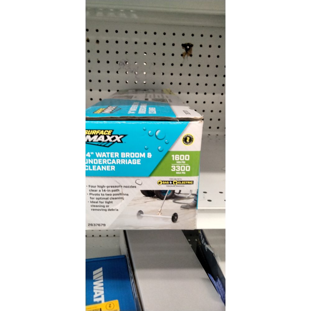 Versatile Cleaning Tool: Acts as a water broom for debris removal and an undercarriage cleaner to safeguard vehicles from dirt and corrosion Compatible with gas or electric pressure washers ranging from 1600 to 3300 PSI Easy Connection: 1/4-in plug fits standard quick connect couplers Wide Reach: 14-in cleaning path and 4 powerful nozzles ensure efficient large-area cleaning Adjustable Head: Seamlessly switches between surface cleaning and undercarriage upkeep Scratch-Free Wheels: Two 4.8-in wheels provide smooth mobility without surface damage Effortless Outdoor Cleaning: Ideal for patios, driveways, and more-removes loose debris like sand, leaves, and light mud Surface Protection: Keeps outdoor areas clean and safe from mud, oils, and debris, while shielding vehicle undercarriages from corrosion Robust, Time-Saving Design: Features sturdy construction, simple setup, and easy maneuverability for reduced cleaning effort Backed by a 2-Year Limited Warranty for Reliability