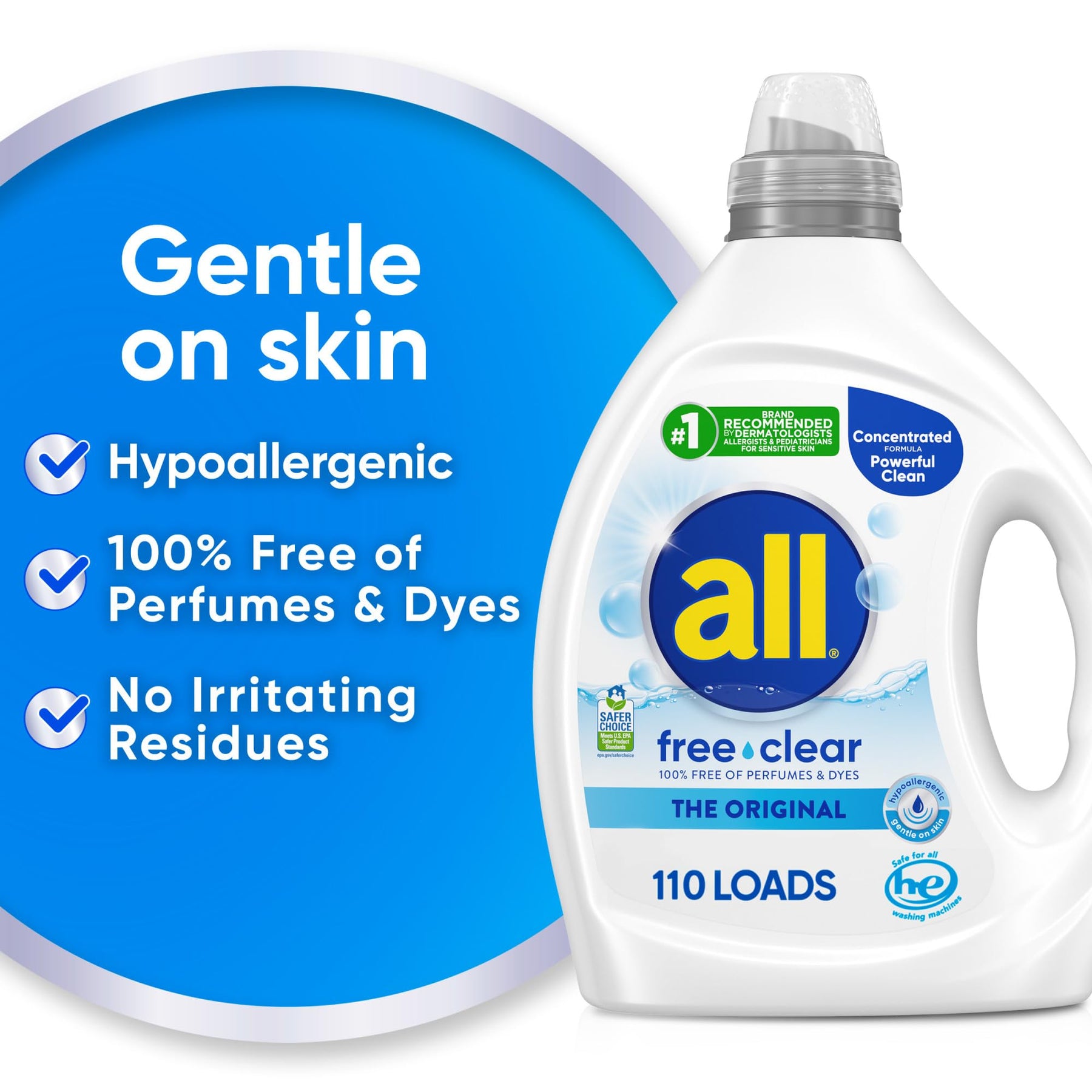 • all free clear is the #1 laundry detergent brand recommended by dermatologists, allergists and pediatricians for sensitive skin.100% free of perfumes and dyes, all free clear liquid laundry detergent provides an effective clean that's gentle on skin