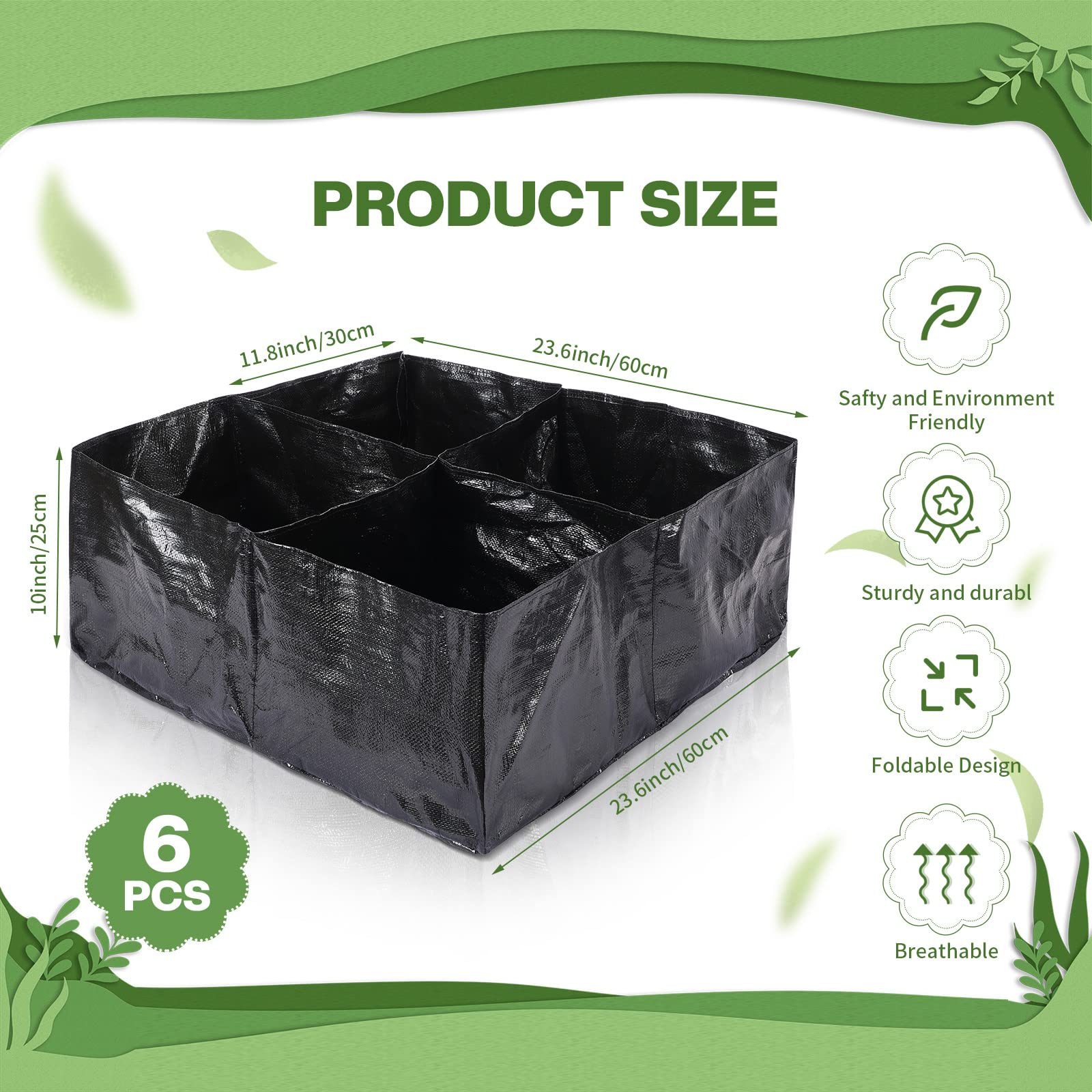 • Enough Quantity and Suitable Size: you will receive 6 pieces of black fabric raised planting beds, plenty to meet your multiple planting needs, each raised grow bed comes with 4 equal sized divider grids for different plants; Product dimensions are approx. 2 feet long, 2 feet wide and 10 inches high