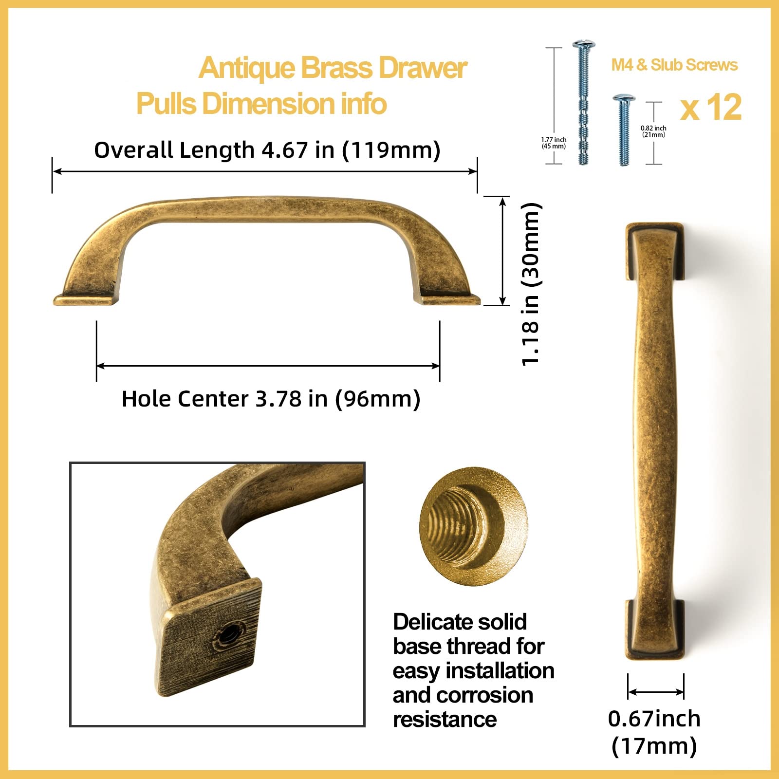 ?Aesthetic appeal?Brushed brass cabinet handles have a warm, classic look that adds elegance and sophistication to any cabinet or drawer. They are available in a variety of styles and sizes, making them suitable for different types of cabinetry ?Durability?Zinc alloy is a sturdy material that is resistant to wear and tear, making it an ideal choice for high-traffic areas like kitchens and bathrooms. It does not corrode or rust easily, which means that it can withstand exposure to moisture and other environmental factors ?Easy maintenance?Brushed brass cabinet handles are easy to clean and maintain. You can use a soft cloth and mild soap to wipe them clean and restore their shine ?Versatility?Brushed brass cabinet handles are versatile and can be used in a variety of design styles, including traditional, transitional, and contemporary. They can complement different types of cabinet finishes, including wood, painted, or laminate ?Package Details?6 cabinet pulls, each pull is equipped with 4 screws(20.9'' + 21.75'' adjustable M4 screws). You can easily make the adjustable screws just about whatever length you want