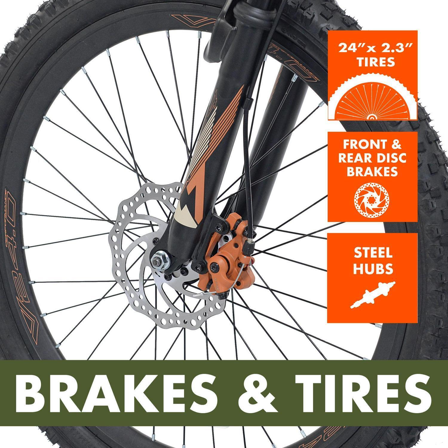 The 24 Ozark Trail Vibe mountain bike hits the sweet spot with its capability versatility and affordability. Sporting a lightweight aluminum frame with a specially tapered headtube this mountain bike is designed specifically for your teen s trail-riding needs. The dual mechanical disc brakes give substantial stopping power during normal trail riding and deep descents. Knobby MTB tires and a front suspension fork let your child tackle tougher terrain with ease. Quickly and smoothly transition through the 8 gears with the handlebar-mounted trigger shifters as you tear up the trail. Adjustability is key for a proper fit so this bike offers an adjustable saddle height for growing riders.