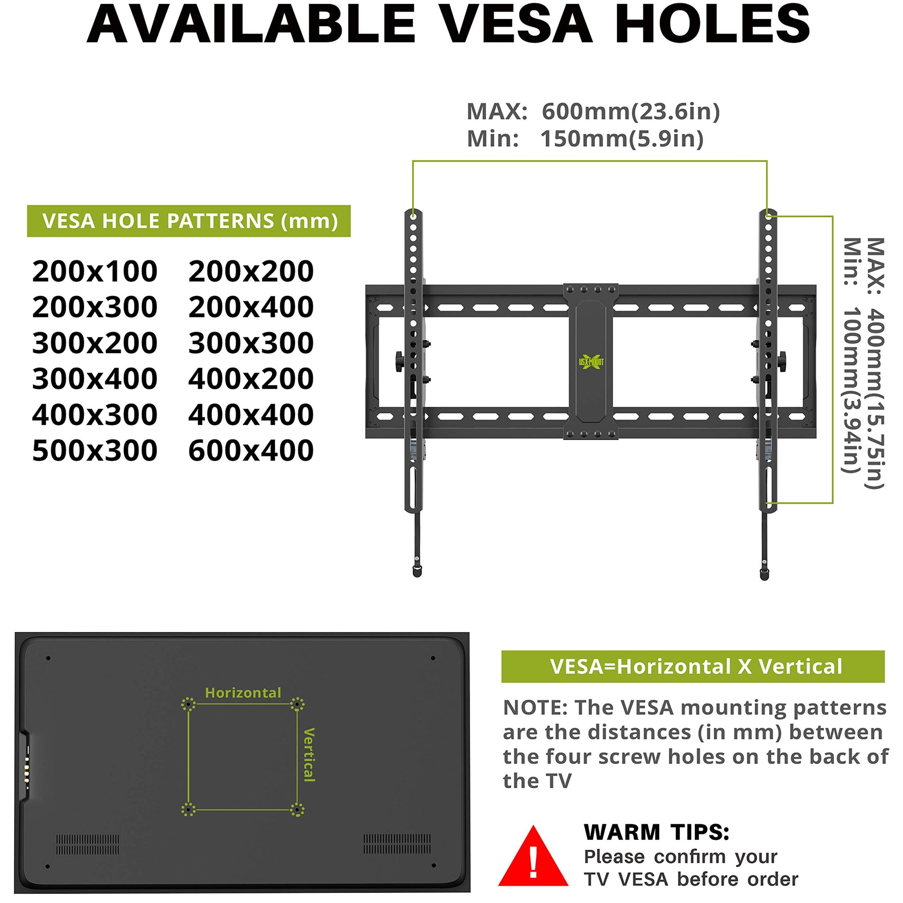 ?UNIVERSAL DESIGN?This Tilt TV wall bracket fits most 37-70" TVs up to 132 LBS, with VESA Size Available from 200100 to 600400mm. Warm tips: Pls confirm your TV information before order. ?TYPS OF WALL?The TV mount can easily install on 12-24 inch wood studs and solid concrete wall, not for dry wall. ?ADJUSTABLE?Tilt angle +12/-12°( Tips: You can too-free tilting the degree), tilt your TV based on your position for a better view. Flush 2.56" Profile away from the wall. ?EASY TO INSTALLATION?Easy to install this TV bracket on wood stud or concrete wall with detailed instruction, all included hardware pre-labelled bags(Remarks can help you distinguish which screw you should use). Pulling straps can help you easily release your TV. ?PRODUCT INCLUDES?Comes with bubble level, 3 pieces pack of cable ties and all standard mounting hardware, 10-year warranty and friendly US-Based customer service.