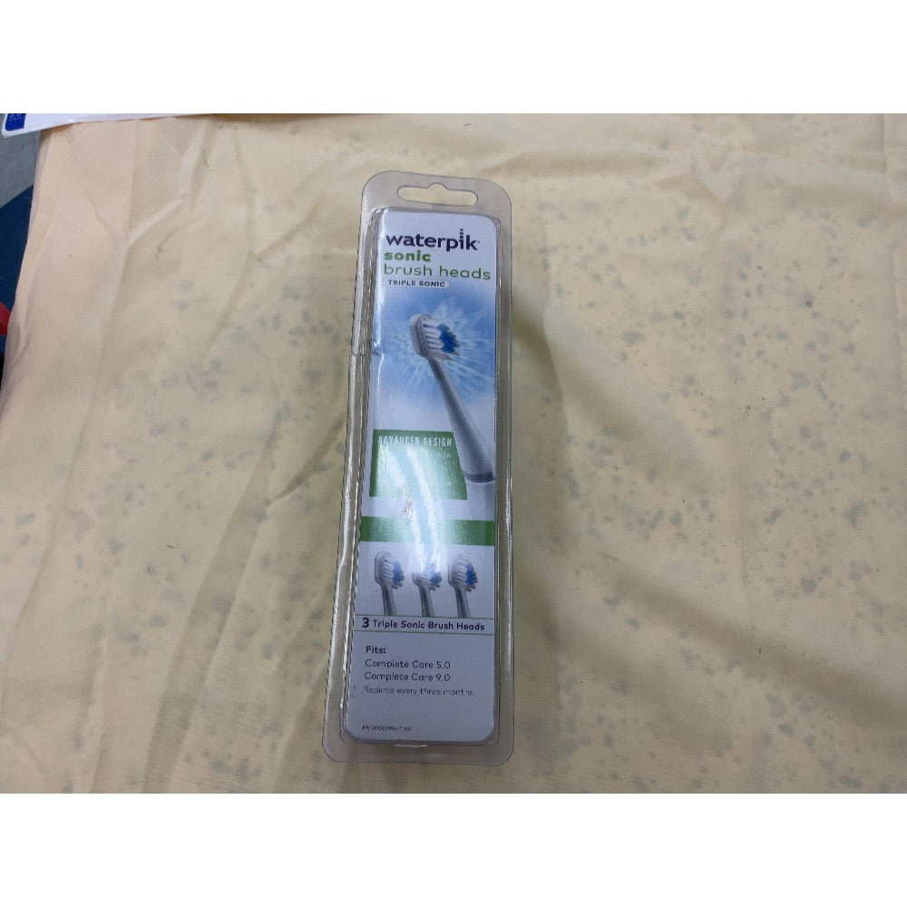 The Waterpik Sonic Brush Heads are designed for use with the Complete Care 5.0 and Complete Care 9.0 models. This pack contains three triple sonic brush heads featuring an advanced design. The heads are engineered to ensure thorough cleaning and compatibility with your Waterpik oral hygiene system, providing convenience and effective oral care.